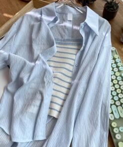 Vapetix XXS-3XL Outerwear set featuring a knitted open jacket, blue shirt, and a French-style long-sleeved thin sun