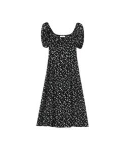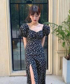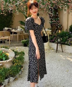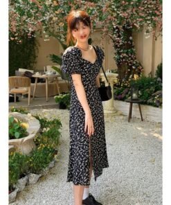 Vapetix 40/45kg/S-65/70kg/XXL French-style square-neck black floral children’s summer dress for 2025, waist-cinching, slimming, e