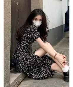 Vapetix 40/45kg/S-65/70kg/XXL French-style square-neck black floral children’s summer dress for 2025, waist-cinching, slimming, e