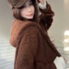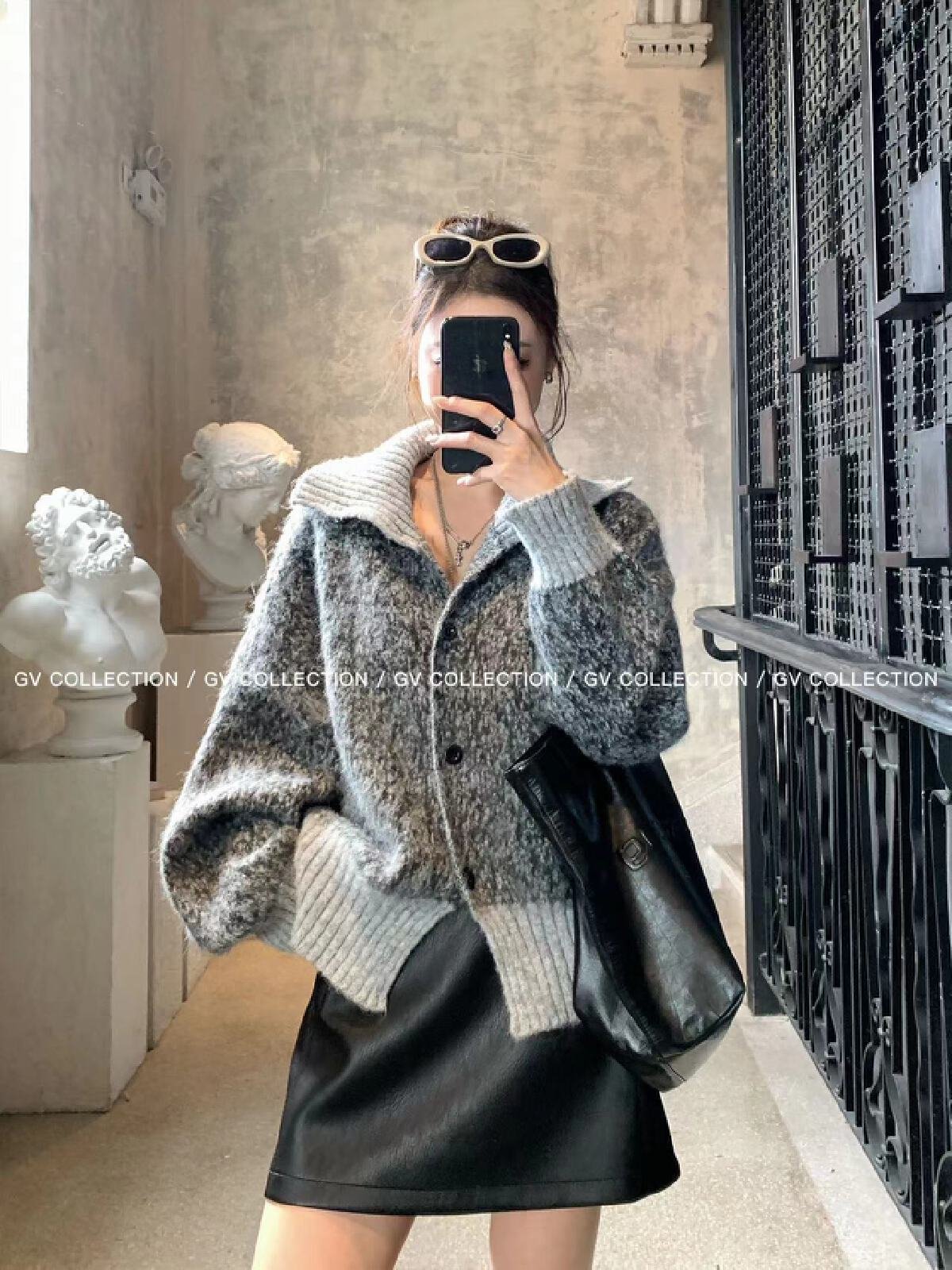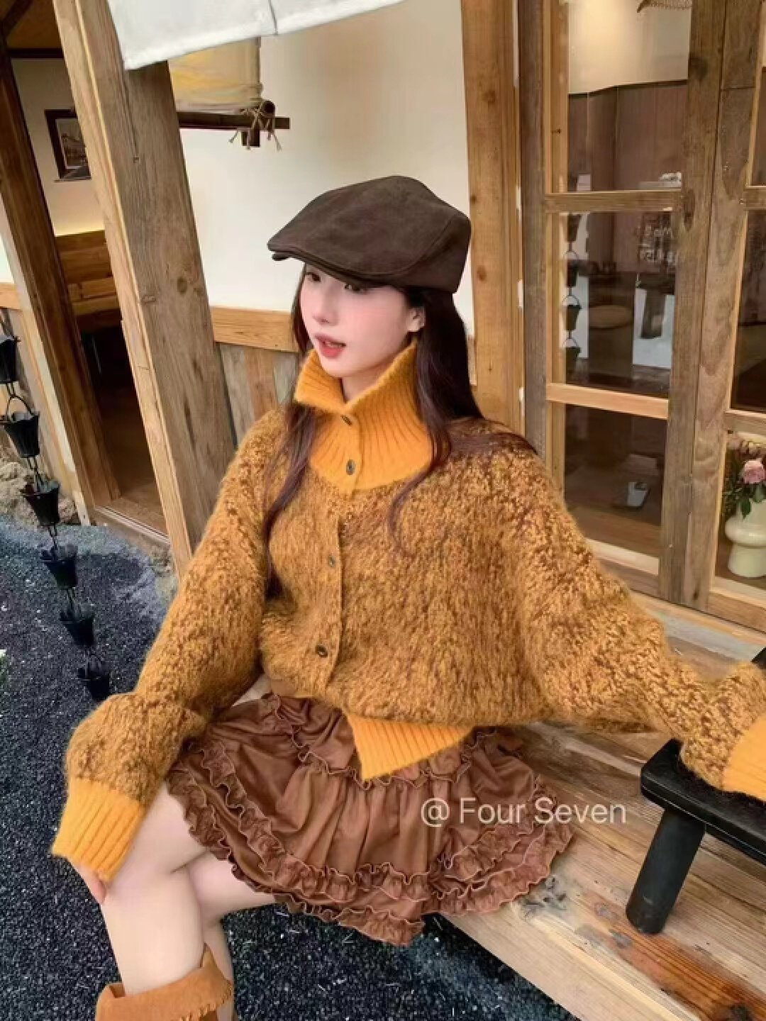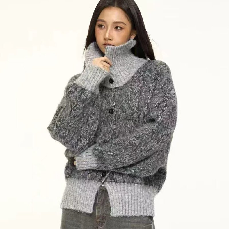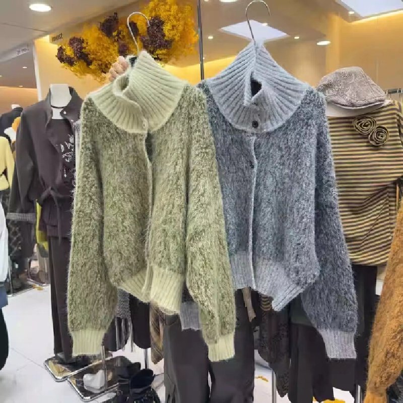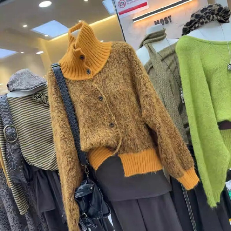 Vapetix Free Size-Free Size 2025 Autumn/Winter American Retro Loose Slouchy Thick Short-Sleeve High-Neck Knit Cardigan Sweatshi