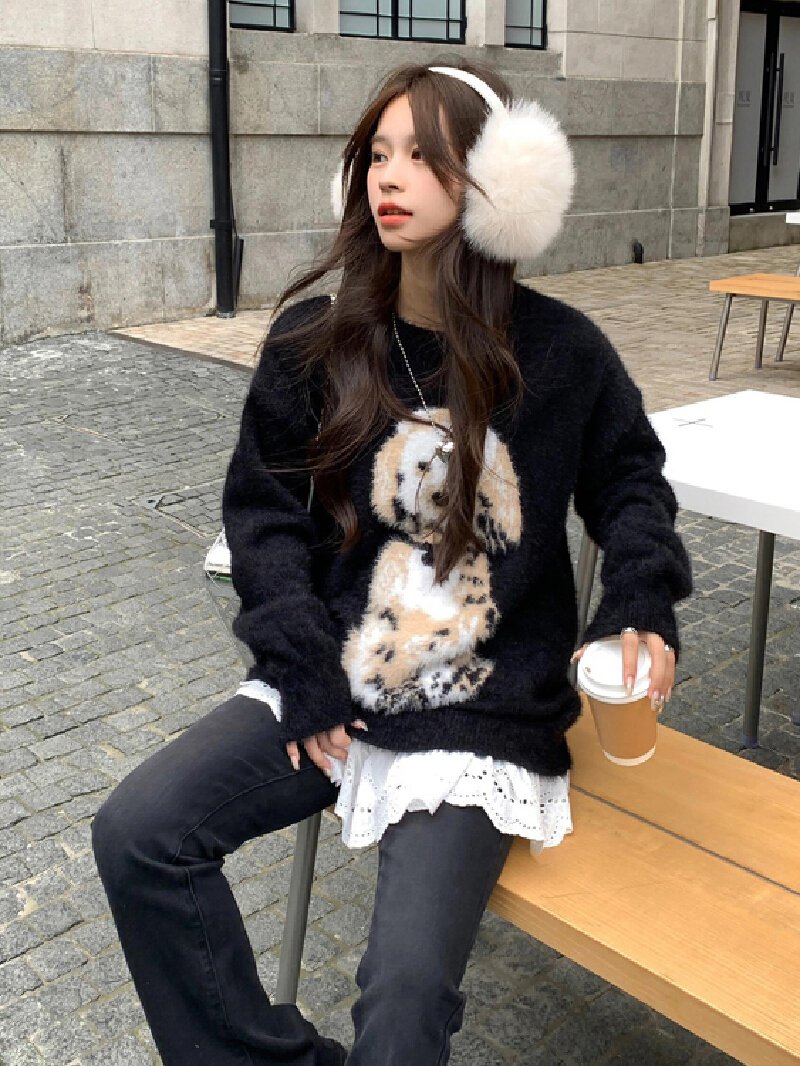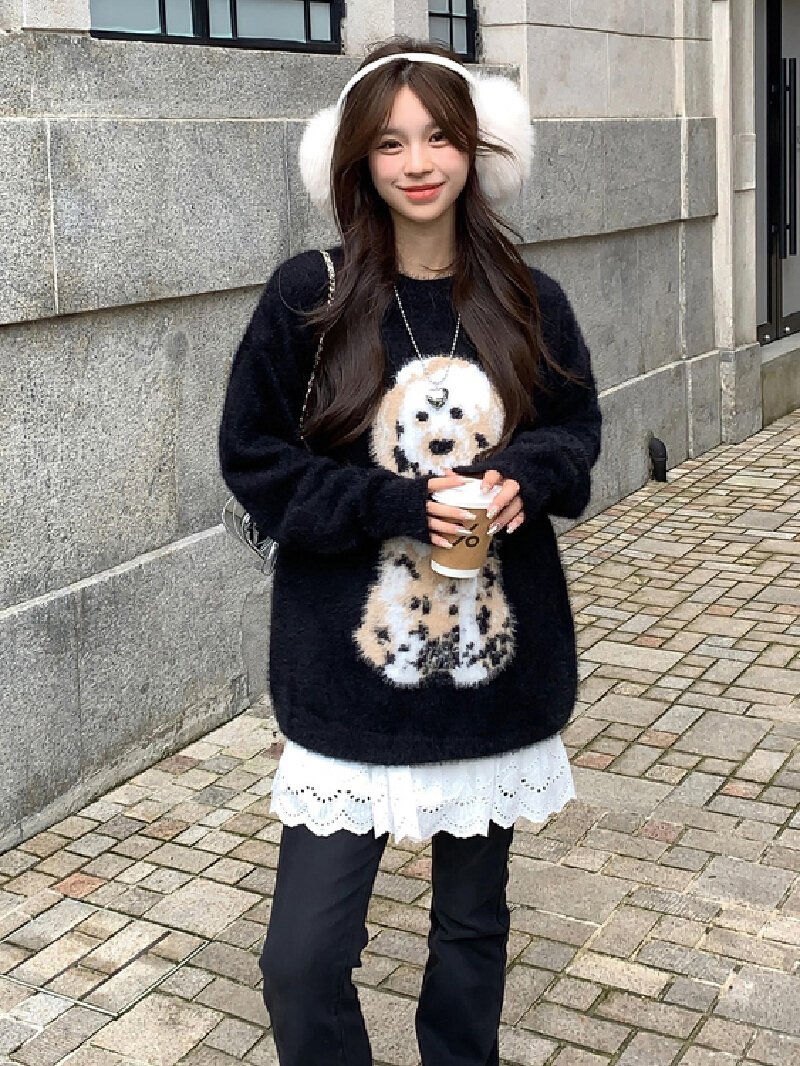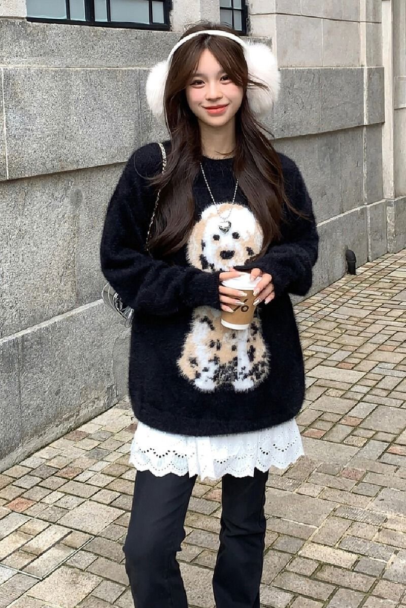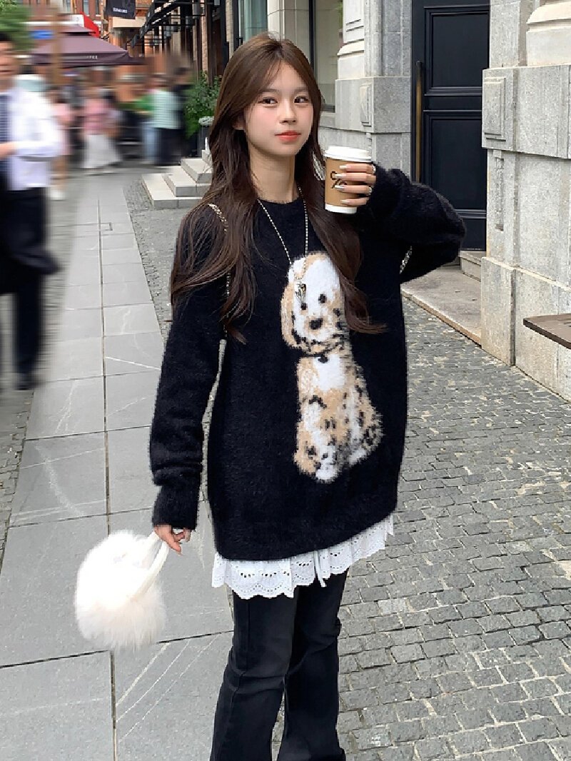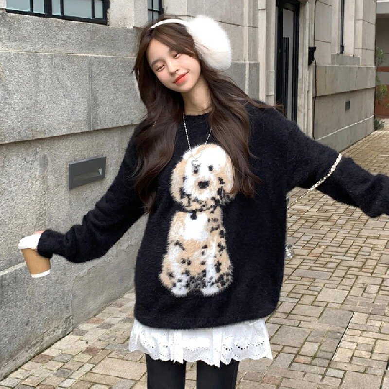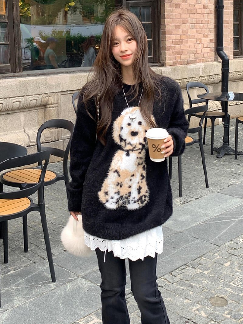 Vapetix Free Size-Free Size American-style Black Dalmatian Crewneck Knitted Sweater Women’s Autumn New Lazy-Style Loose All-Mat