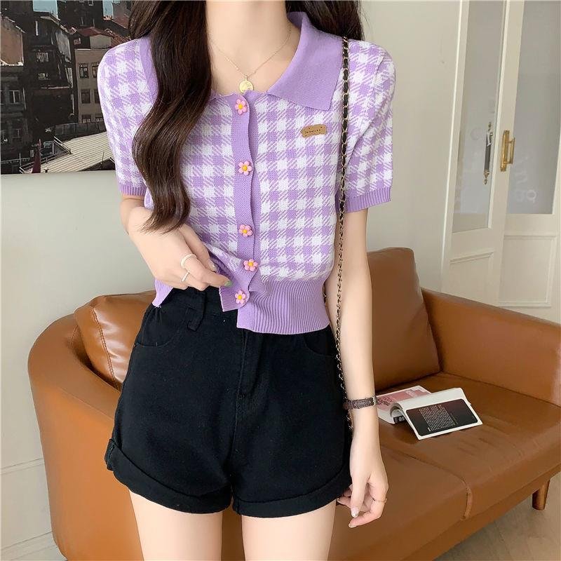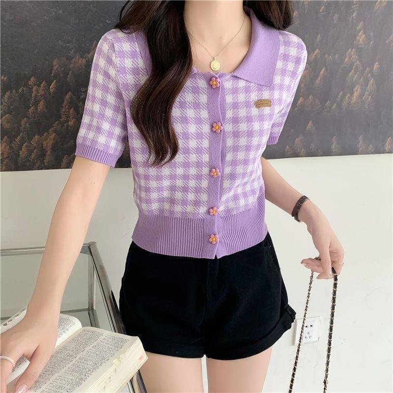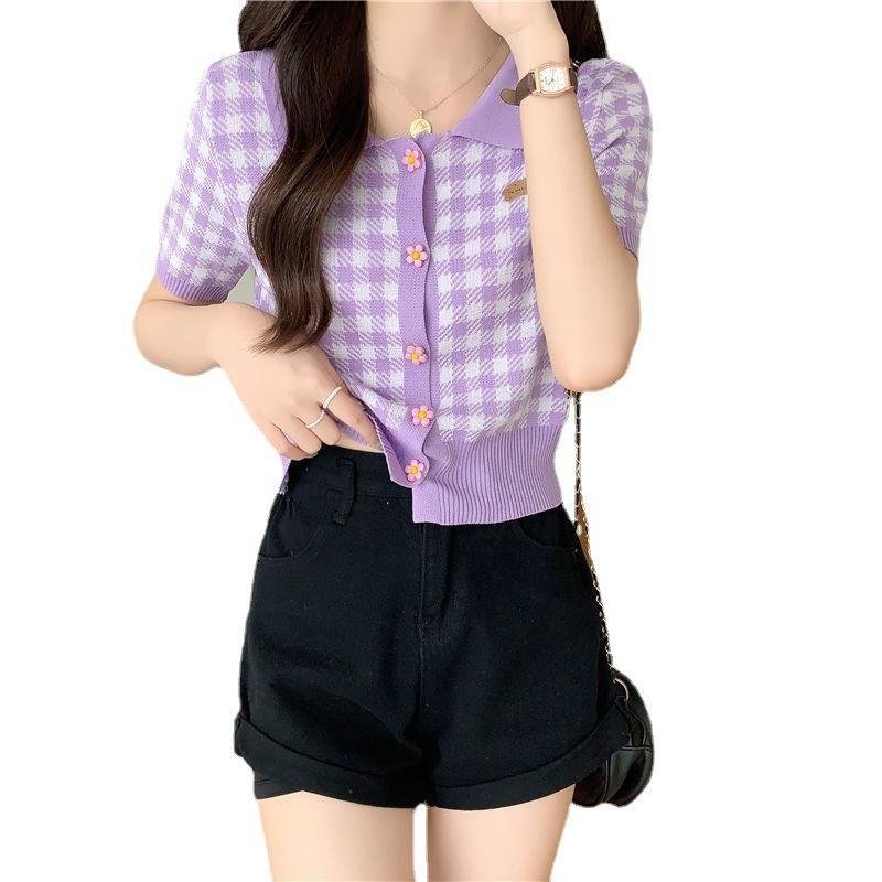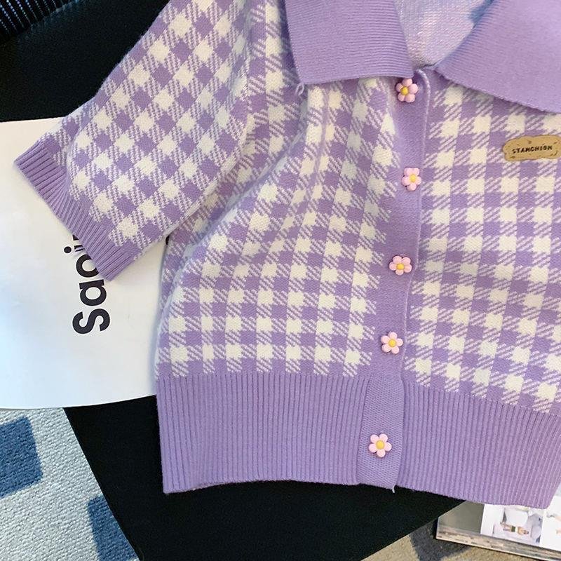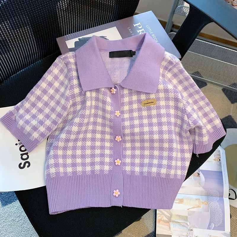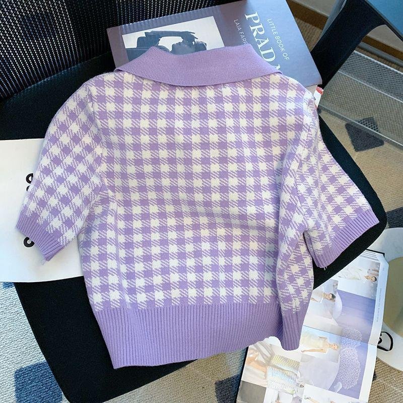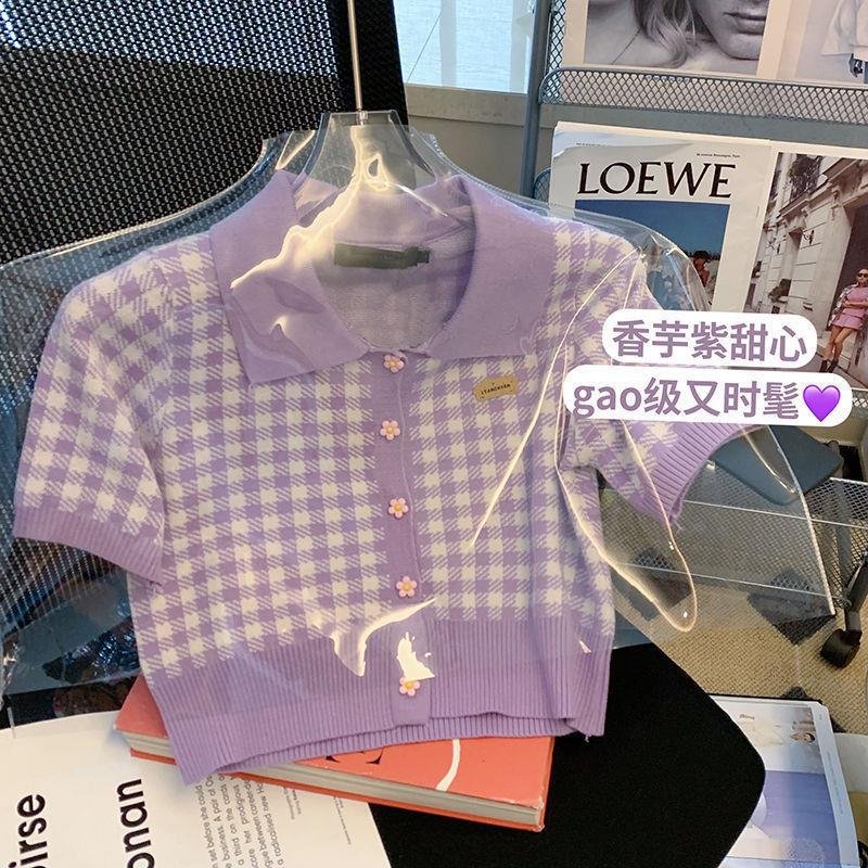 Vapetix Free Size-Free Size French-style gentle purple short-sleeved knitted sweater for women, summer design, unique, small-to