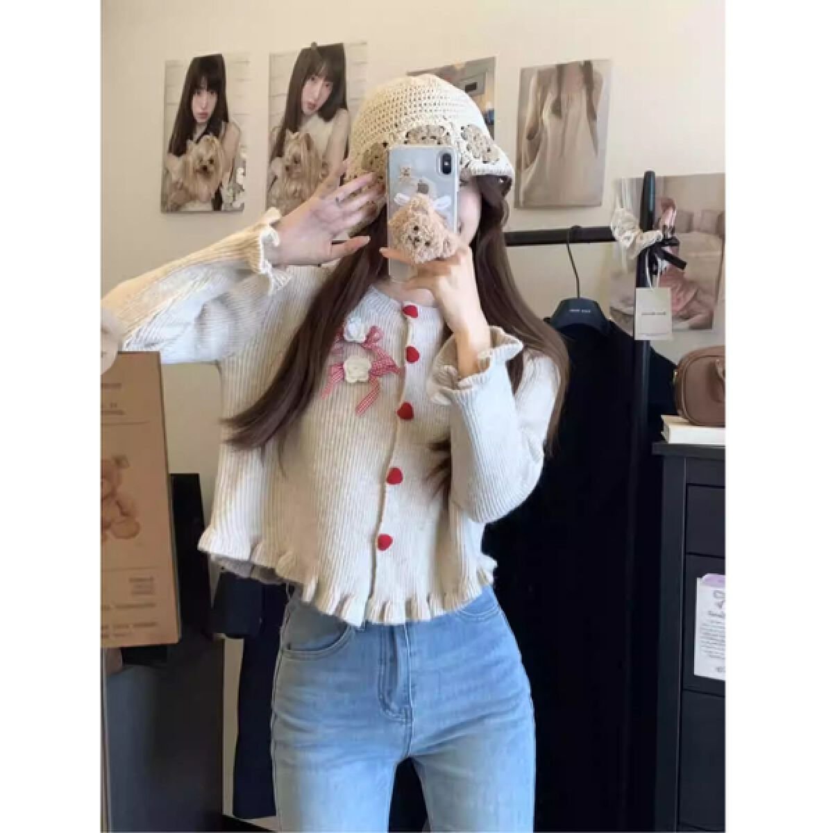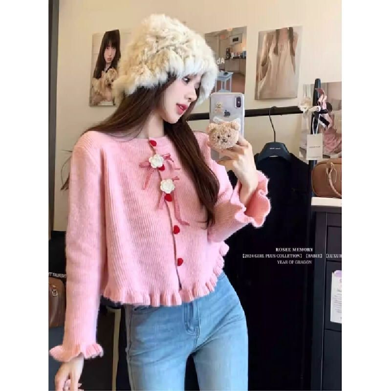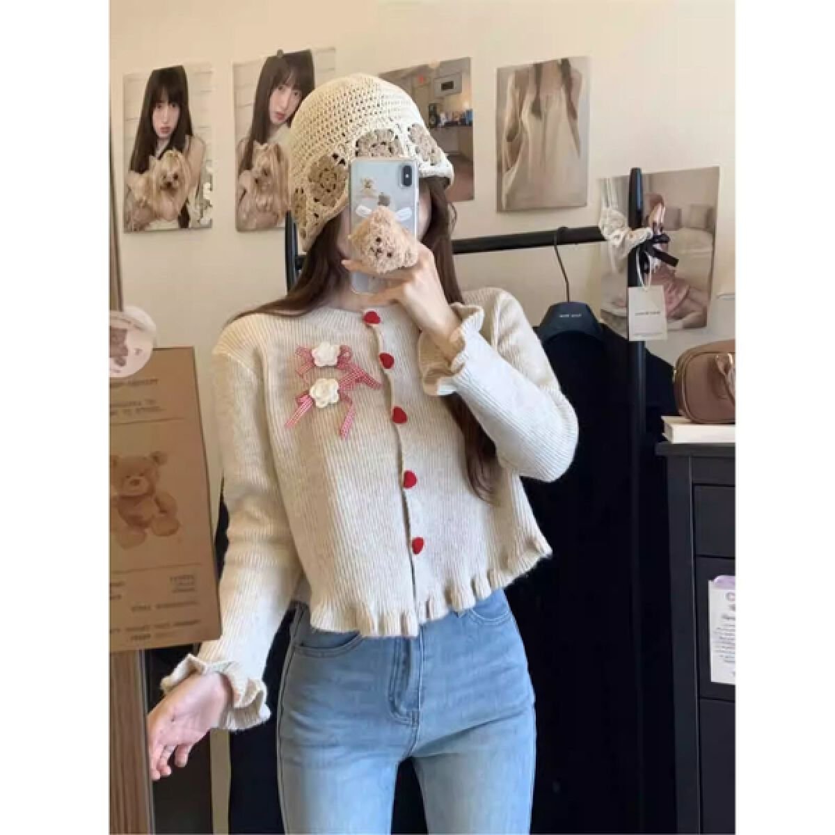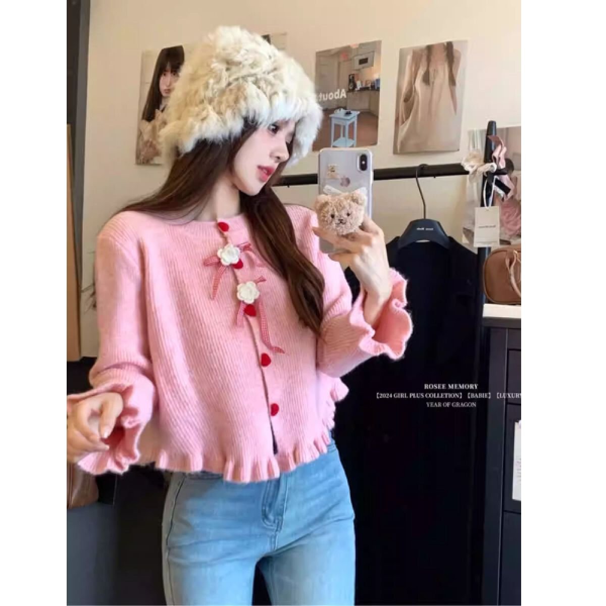 Vapetix Free Size-Free Size Korean style bowknot lace long-sleeved sweater coat for women autumn new gentle sweet soft knitted