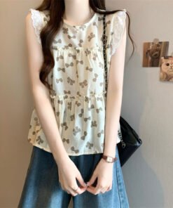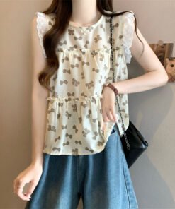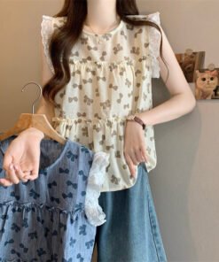 Vapetix Free Size-Free Size Real shot New version French lace flared sleeve sleeveless doll shirt blouse