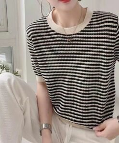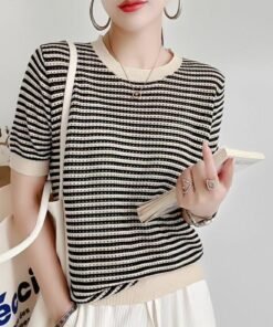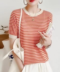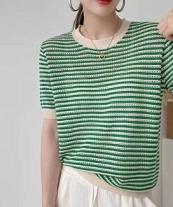 Vapetix Free Size-Free Size Round-neck striped knitted women’s short-sleeved hollow-out design cross-border summer new style si