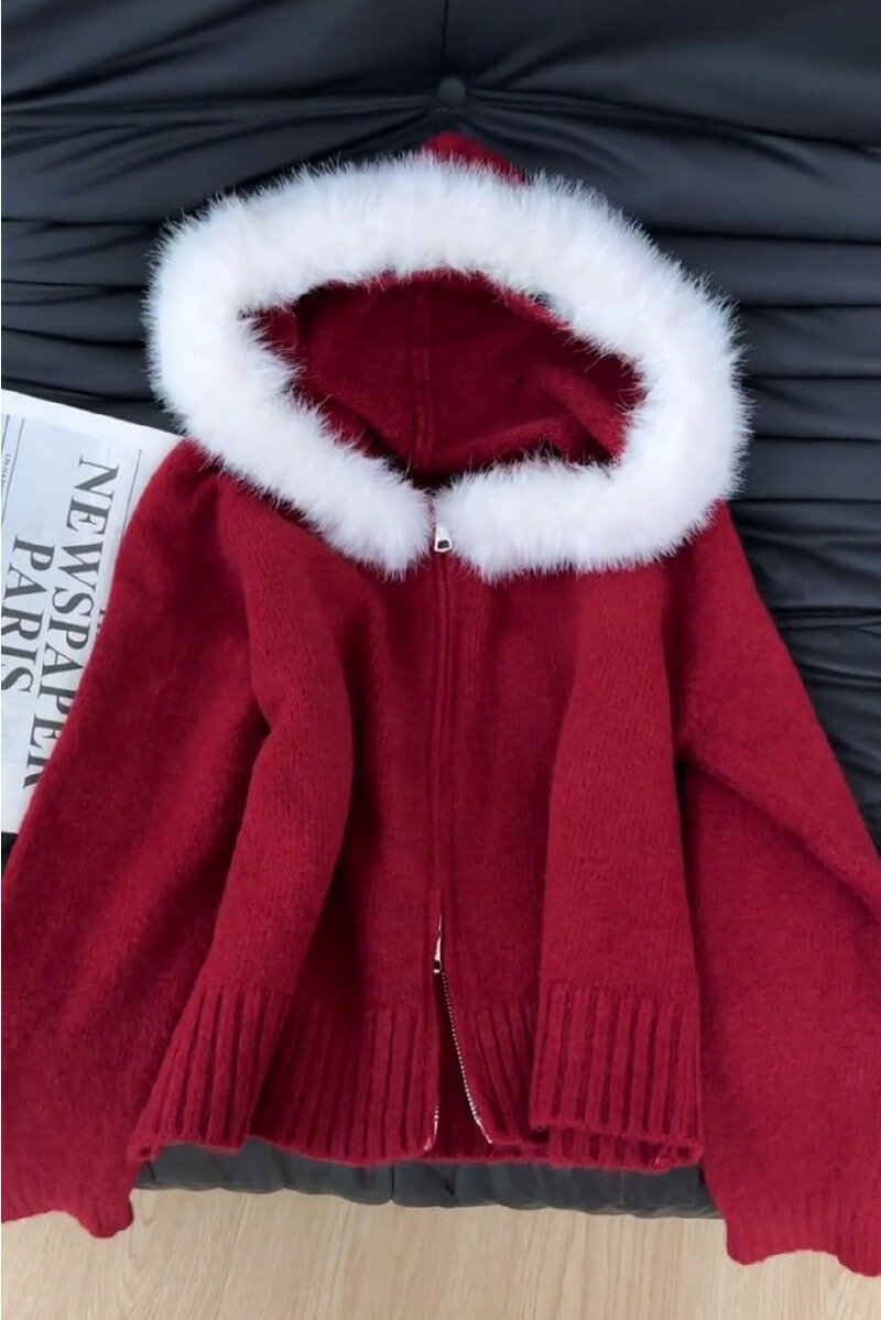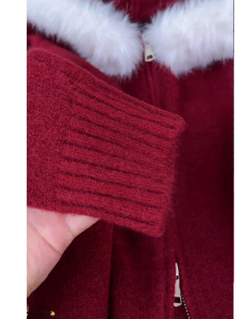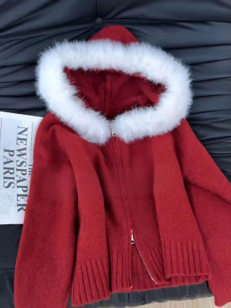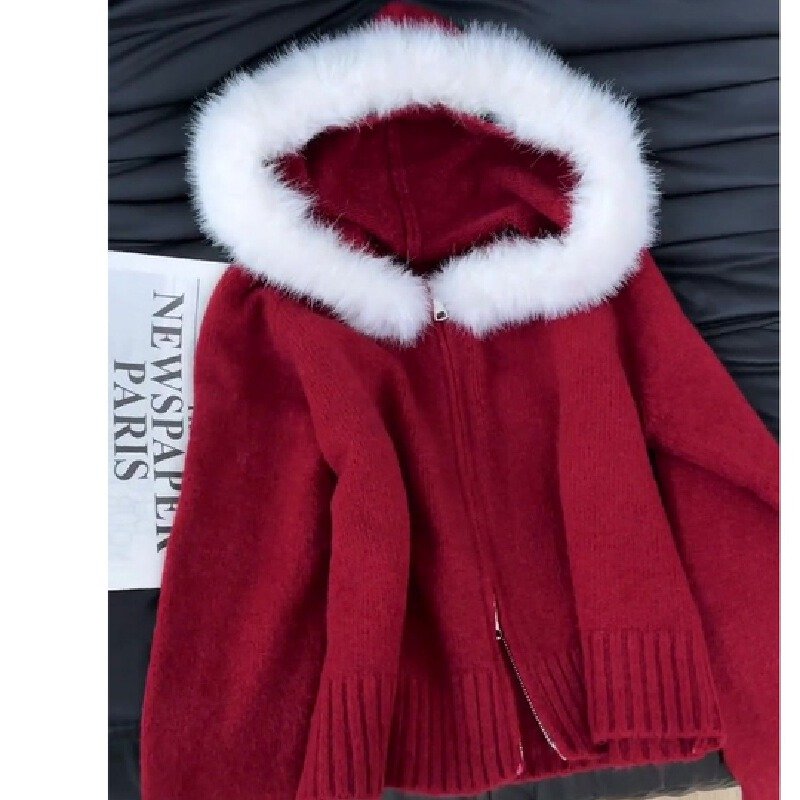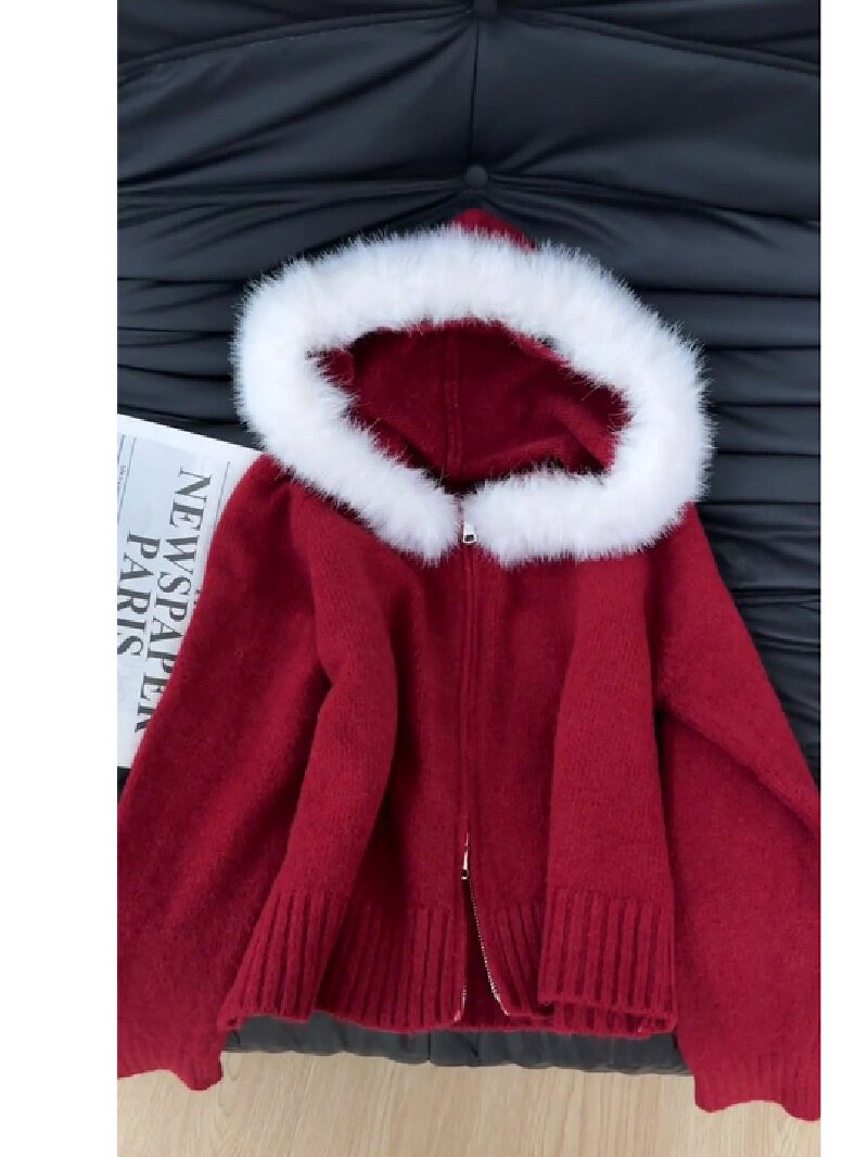 Vapetix Free Size-Free Size Stylish Red Christmas and New Year Women’s Thick Hooded Knit Cardigan Coat for Autumn and Winter