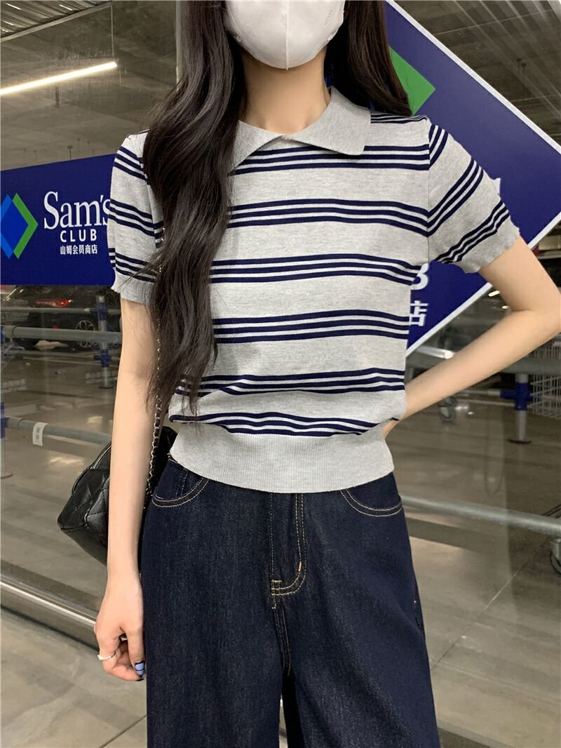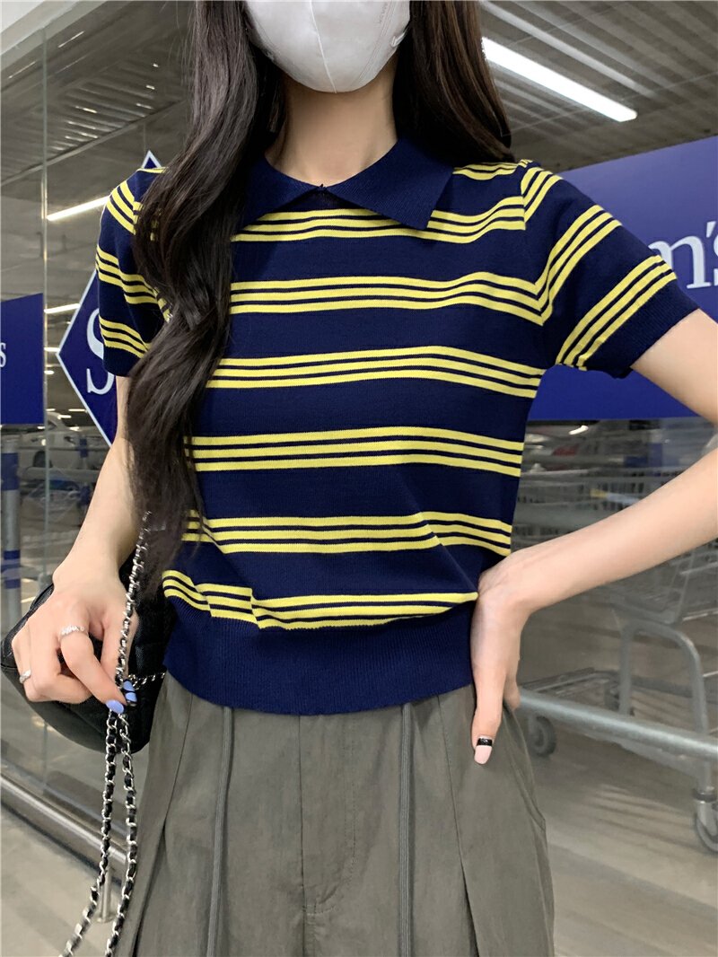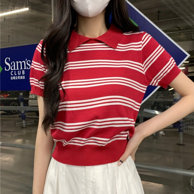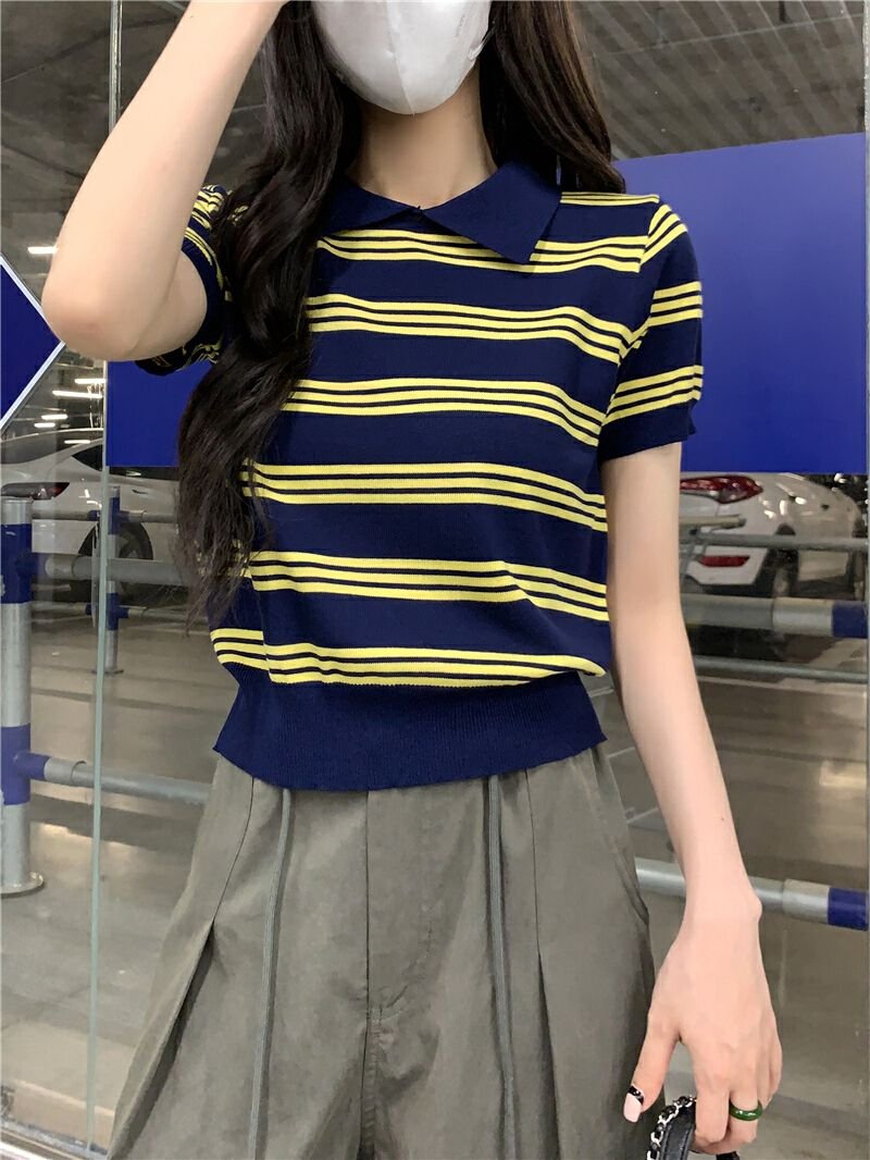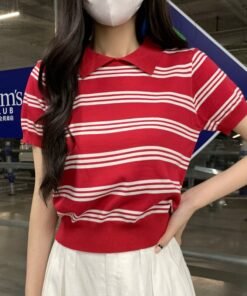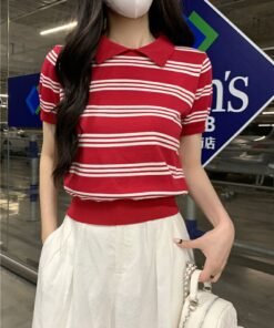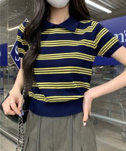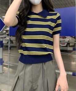 Vapetix Free Size-Free Size Women’s 2025 Summer Striped Polo Knit T-Shirt – Stunning Top