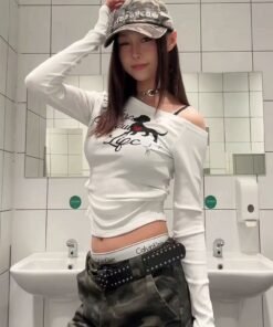 Vapetix M-2XL “Ribbed V-Neck Sloping Shoulder Americana Retro Hot Girl Long-Sleeve T-Shirt for Women – Early Autu