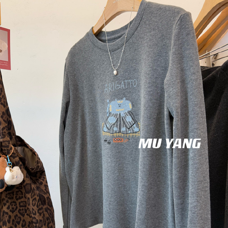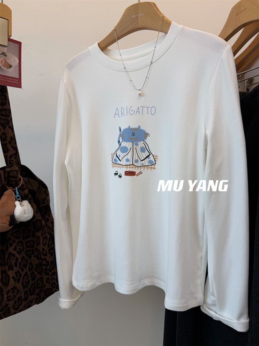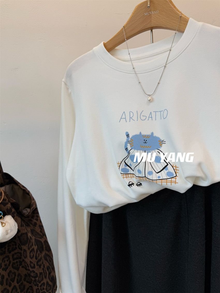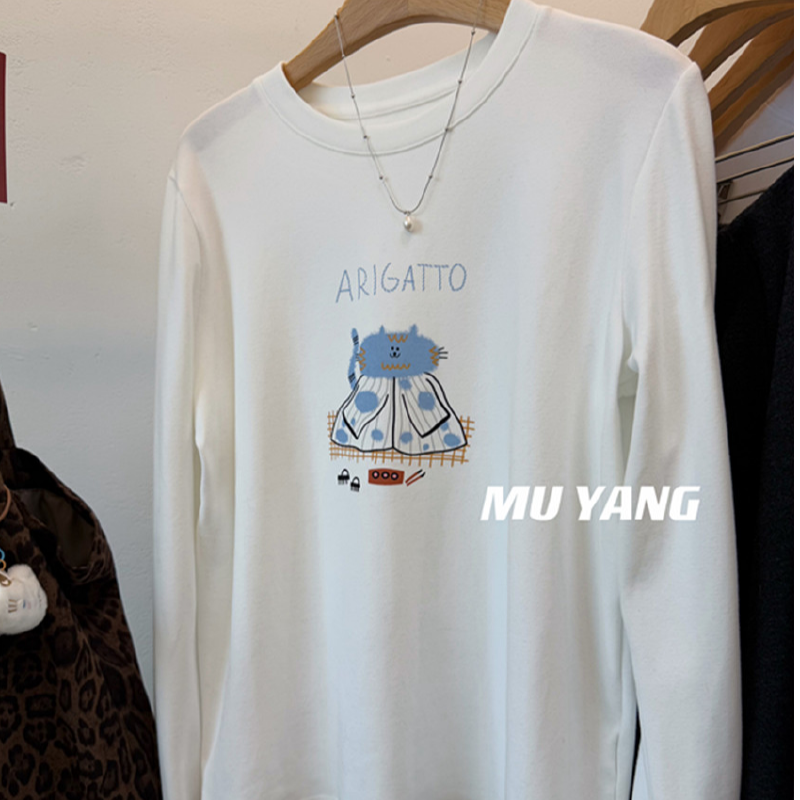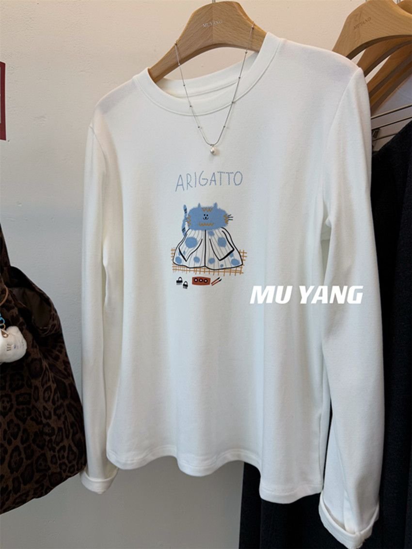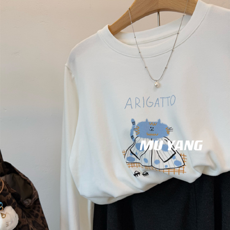 Vapetix M-3XL Blue Sleepwear Cat Cartoon Long Sleeve Fleece T-Shirt for Women 2025 Autumn Winter Inner Wear Casua