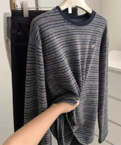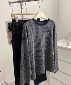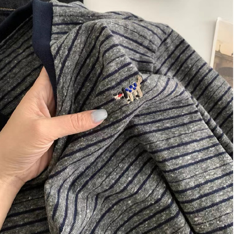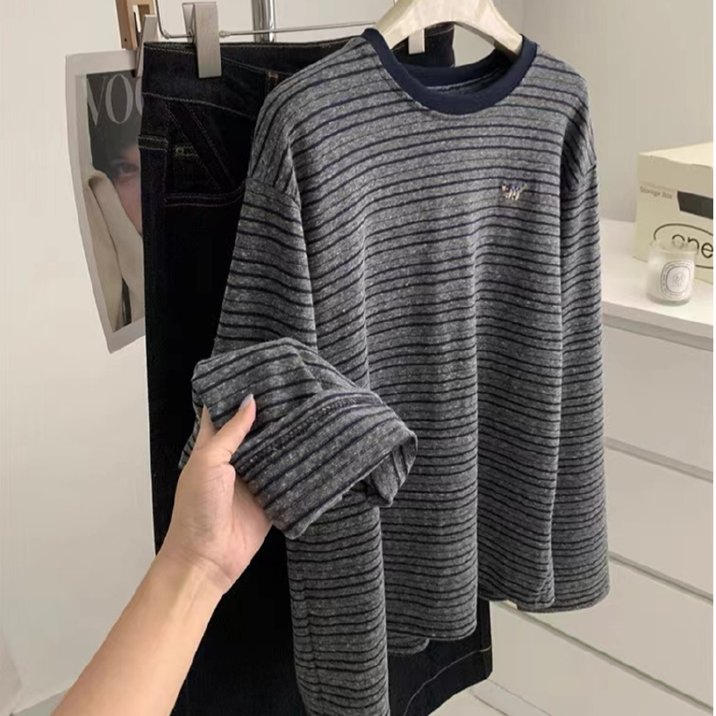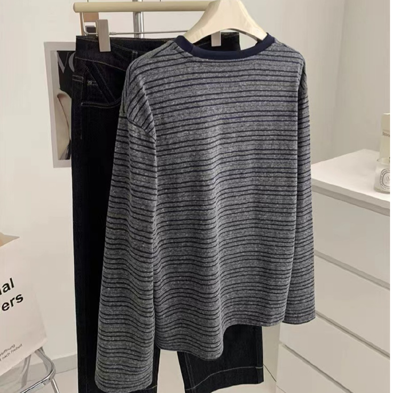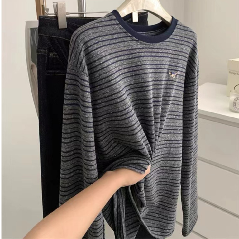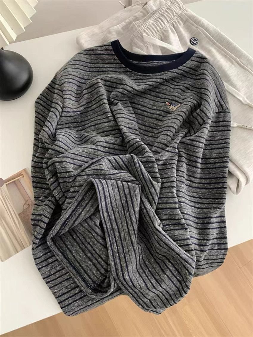 Vapetix M-3XL Korean-style retro striped women’s lazy whitening navy blue round neck embroidered base shirt for a