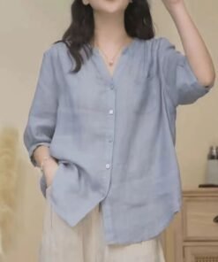 Vapetix M-3XL Korean Version Art Deco Retro Summer Thin Cotton Linen Shirt Women Loose V-Neck Blouse Jacket Casua
