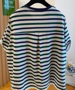 Vapetix M-4XL Large Code 300 Pounds Striped Women’s Short Sleeve Lace Hem V-Neck Top with Slits