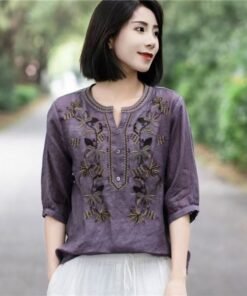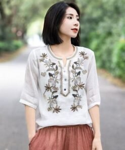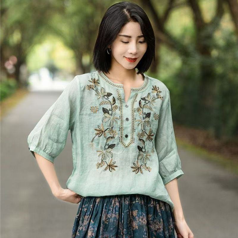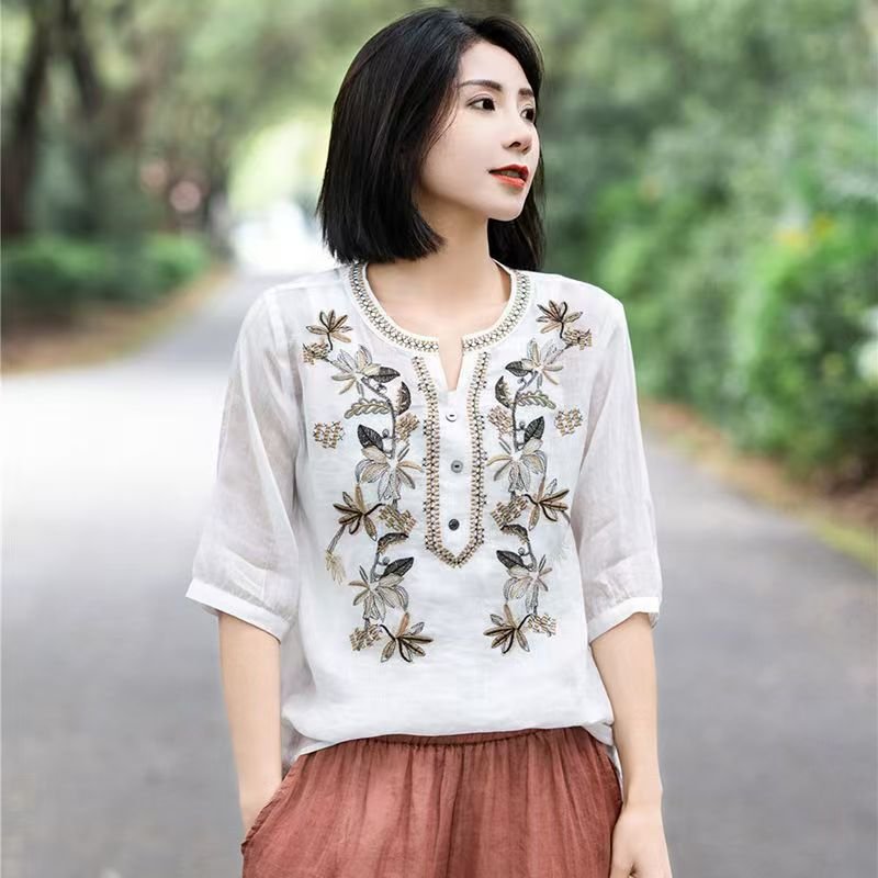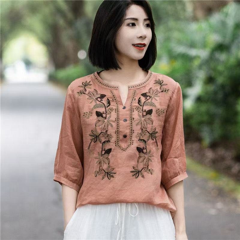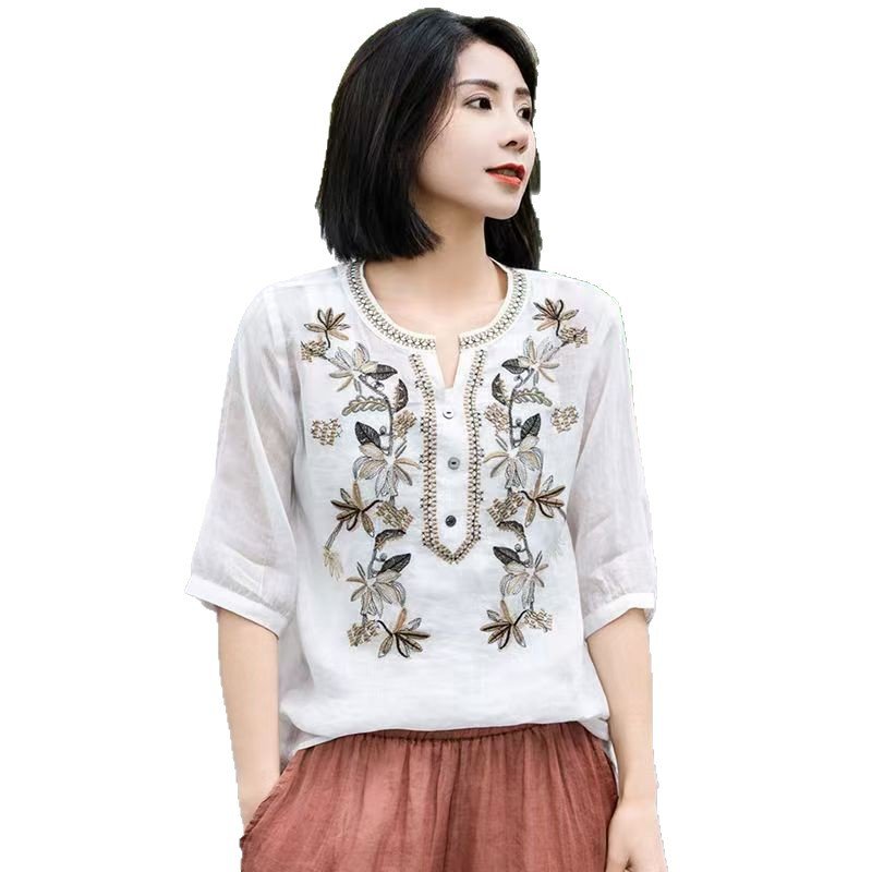 Vapetix M-4XL Vintage Ethnic Style Embroidered Cotton-Linen Women’s Blouse Short Sleeve New Arrival Summer Casual