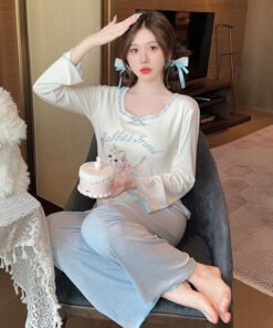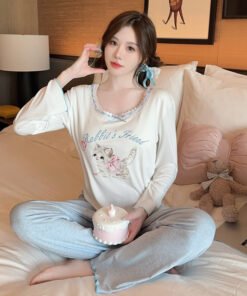 Vapetix M-XL 2-Color 【With Unremovable Chest Pads】Spring and Autumn Long-Sleeve Nightgown Set for Women, Modal C