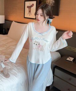 Vapetix M-XL 2-Color 【With Unremovable Chest Pads】Spring and Autumn Long-Sleeve Nightgown Set for Women, Modal C