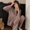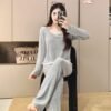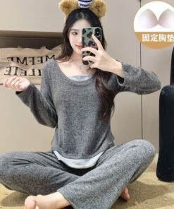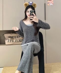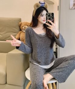 Vapetix M-XXL Cashmere-designed faux two-piece color-block pajamas for women: Autumn/Winter long-sleeve top and p