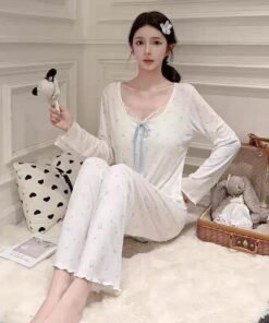 Vapetix M-XXL Spring and Autumn Flower Edge Butterfly Bow Blouse and Pants Women’s Ice Silk Ribbed Long Sleeve Lo