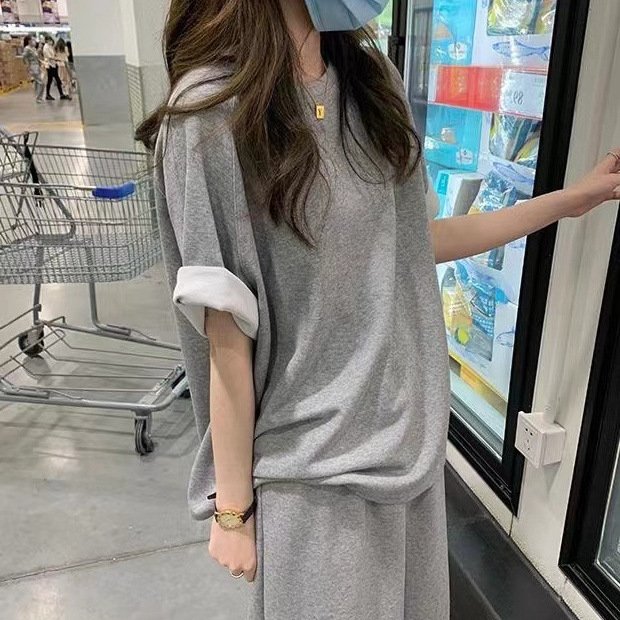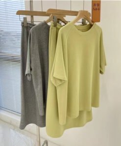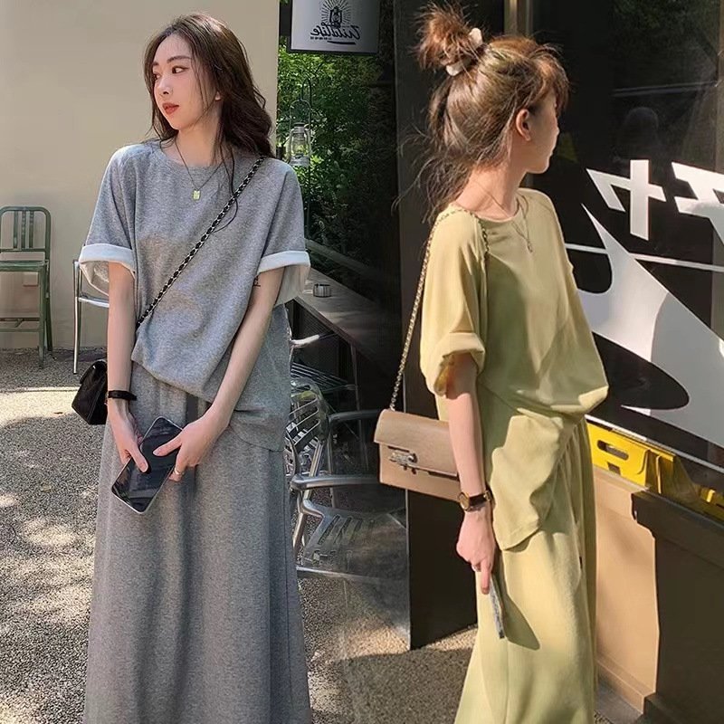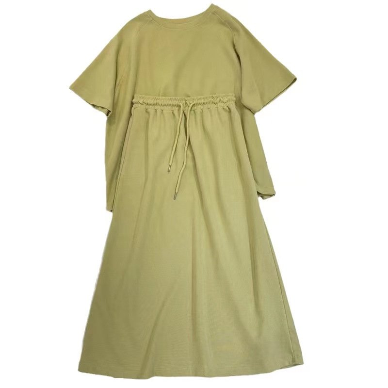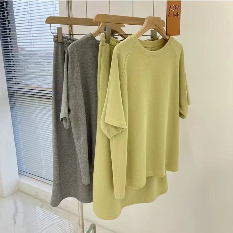 Vapetix M-XXL Summer clear age-defying green casual two-piece set pure color short-sleeved T-shirt + mid-length s