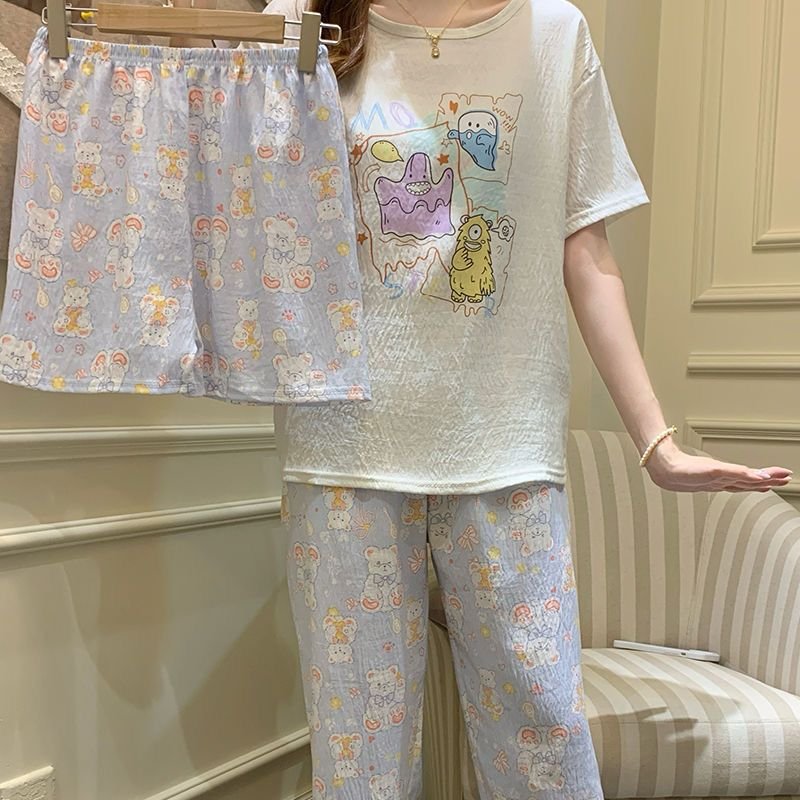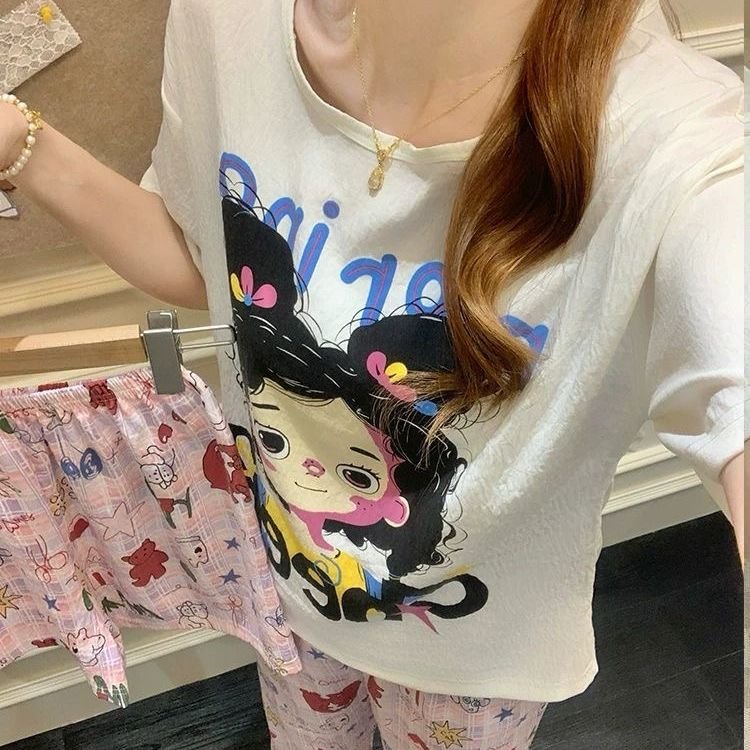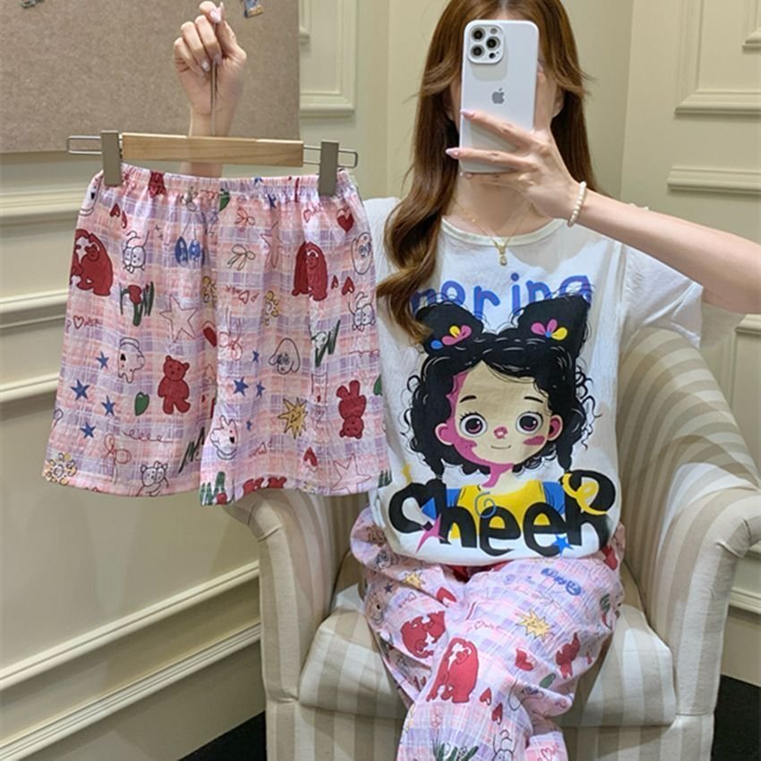 Vapetix M-XXL Three-Piece Pajama Set for Women: Short-Sleeve Top and Long Pants, Summer Cartoon Style, Stylish an