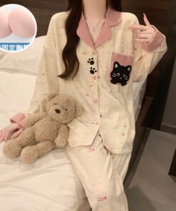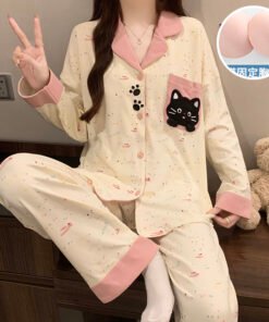 Vapetix M-XXL Women’s Set: Collared Long-Sleeve Open-Front Pajama Top with Cotton-Poly Blend and Built-in Bralett