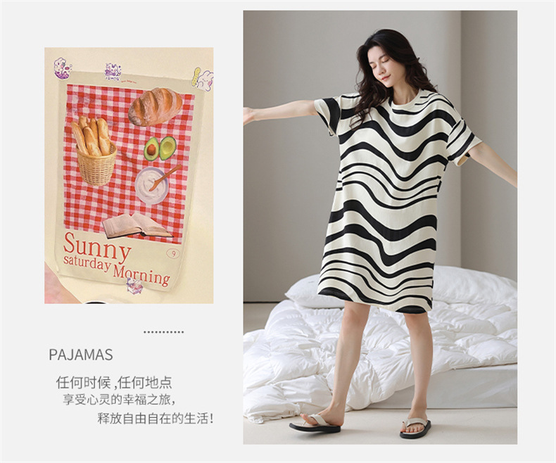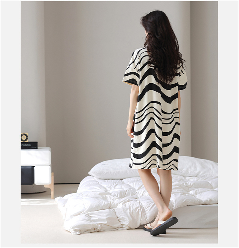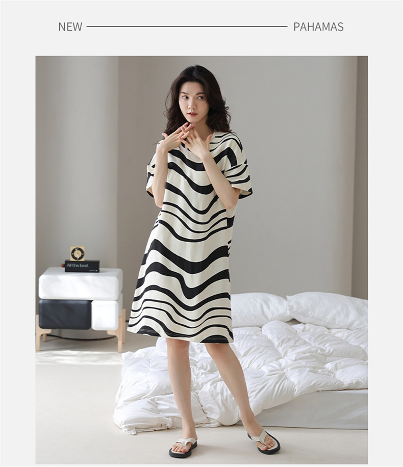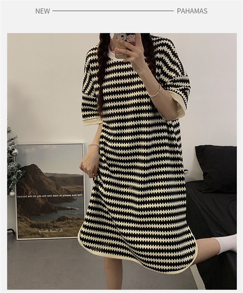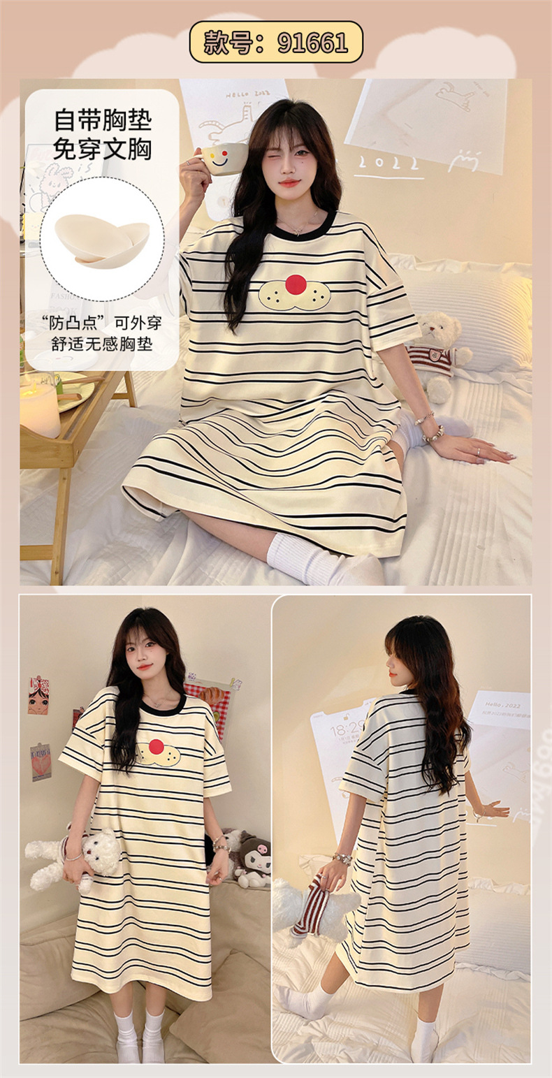 Vapetix M-XXL Women’s Summer Short-sleeved Crewneck Nightdress with Chest Pad New Arrival Striped Cartoon dress O