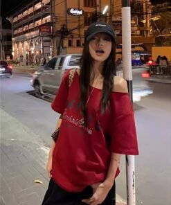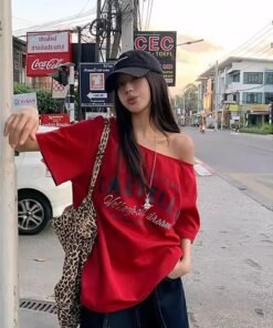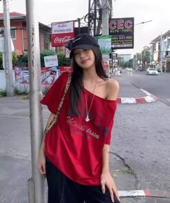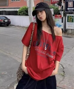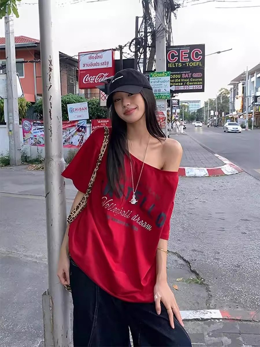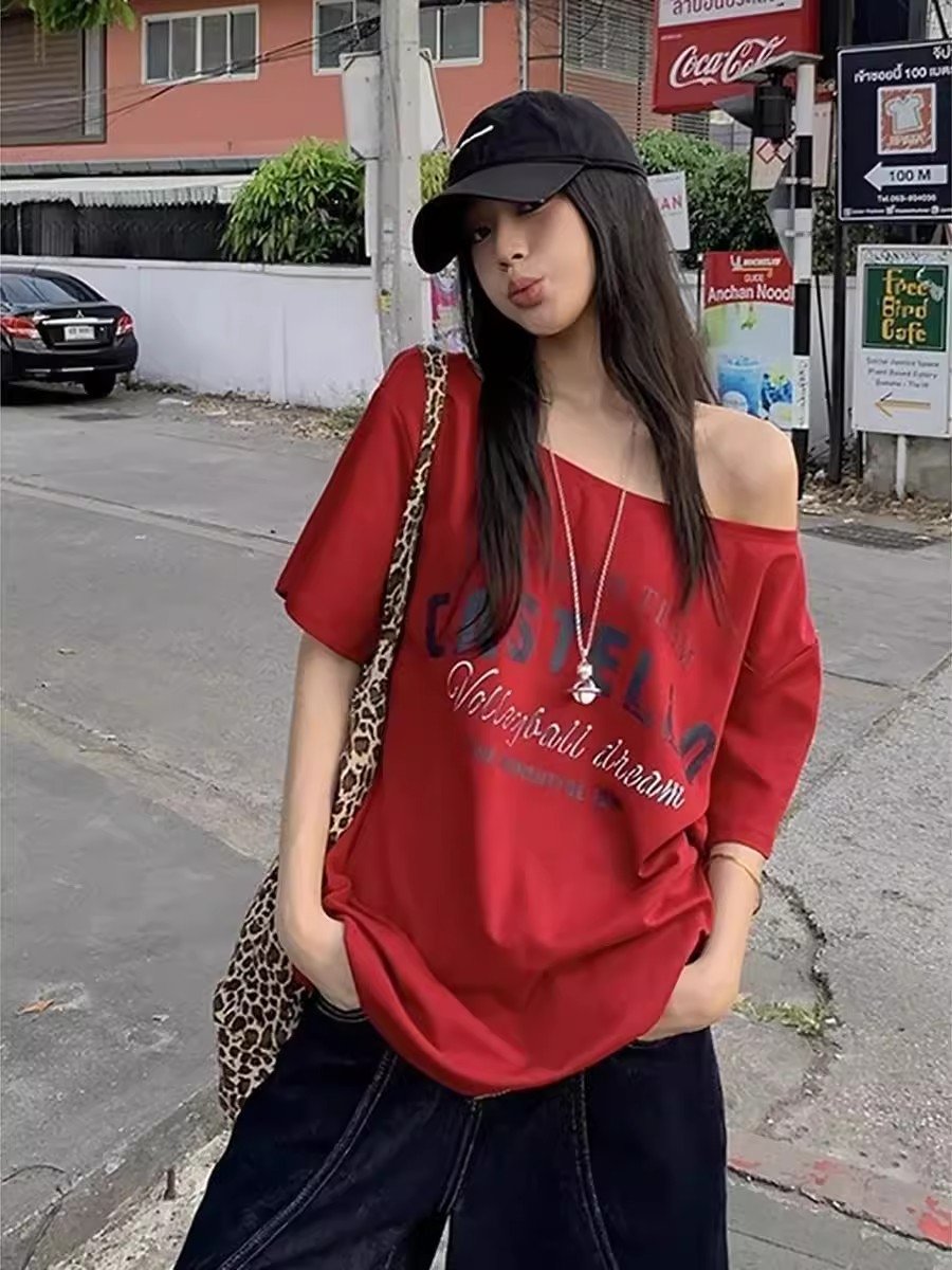 Vapetix S-2XL American Retro Sloping Shoulder Short-Sleeve T-Shirt for Women – Summer Design, Unconventional and
