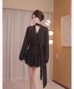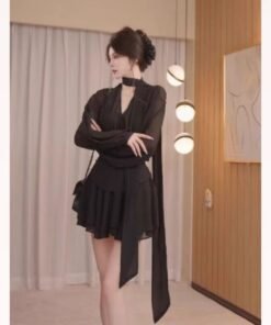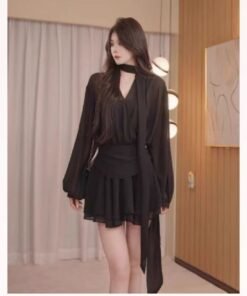 Vapetix S-2XL V-neck black women’s summer 2025 new retro short pleated tie-dye chiffon dress with design sense, b