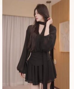 Vapetix S-2XL V-neck black women’s summer 2025 new retro short pleated tie-dye chiffon dress with design sense, b