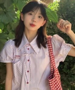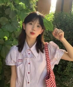 Vapetix S-2XL Women’s Summer New College Style Striped Short Sleeve Shirt with Bowknot and Bubbling Sleeve, Uncom