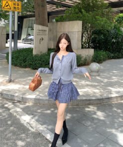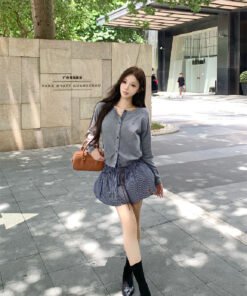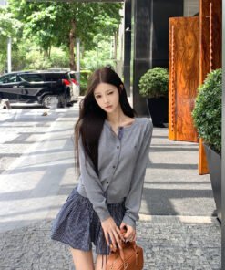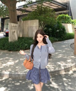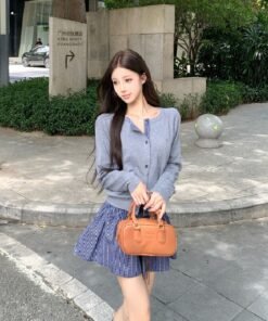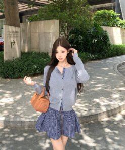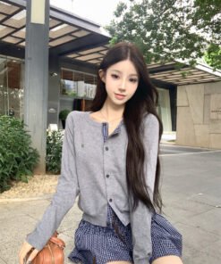 Vapetix S-L Photographed~ Early Autumn Relaxed Feeling Grid Splicing Wool Knit Cardigan Women + Waist Embossed