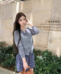 Vapetix S-L Photographed~ Early Autumn Relaxed Feeling Grid Splicing Wool Knit Cardigan Women + Waist Embossed