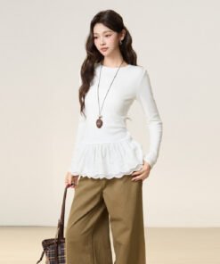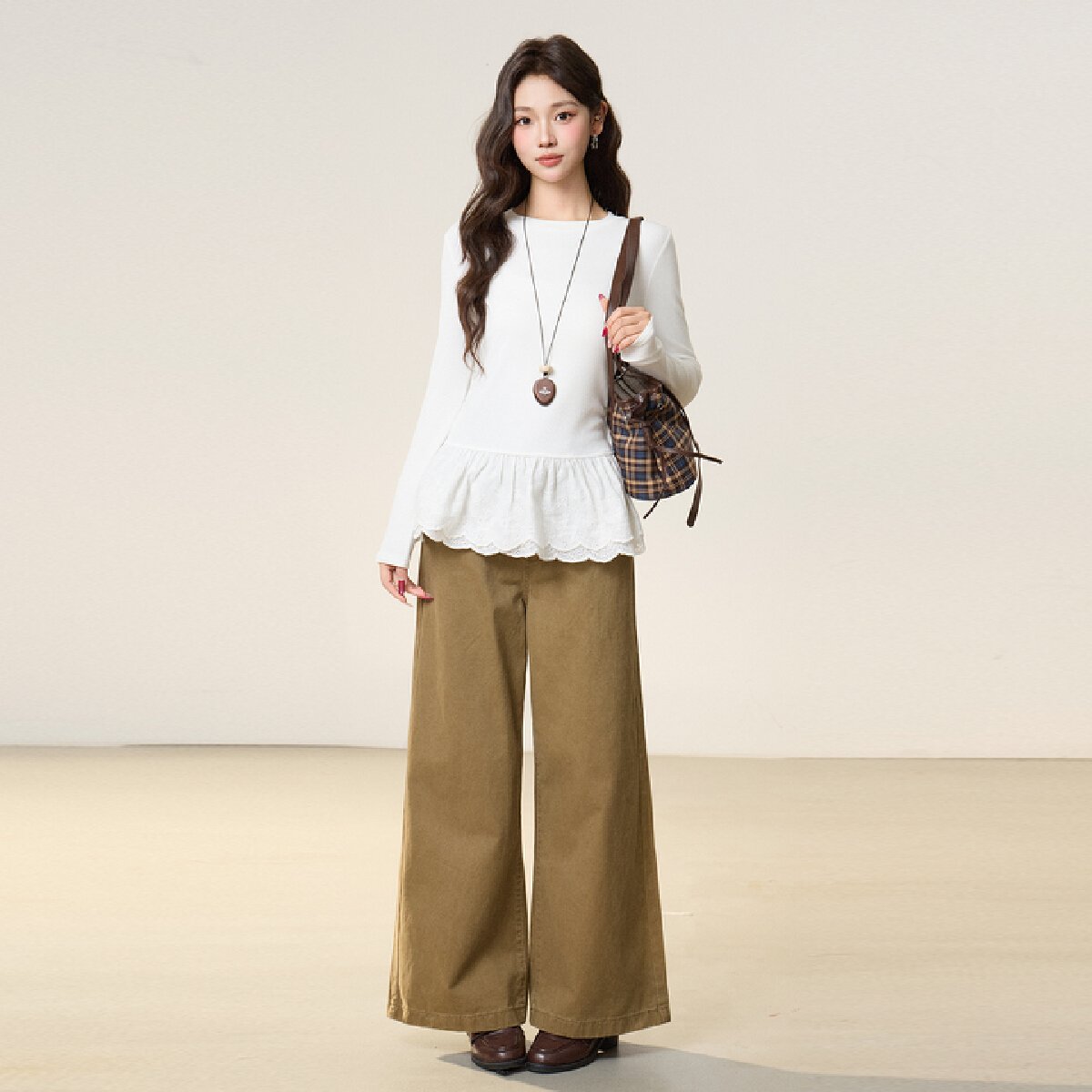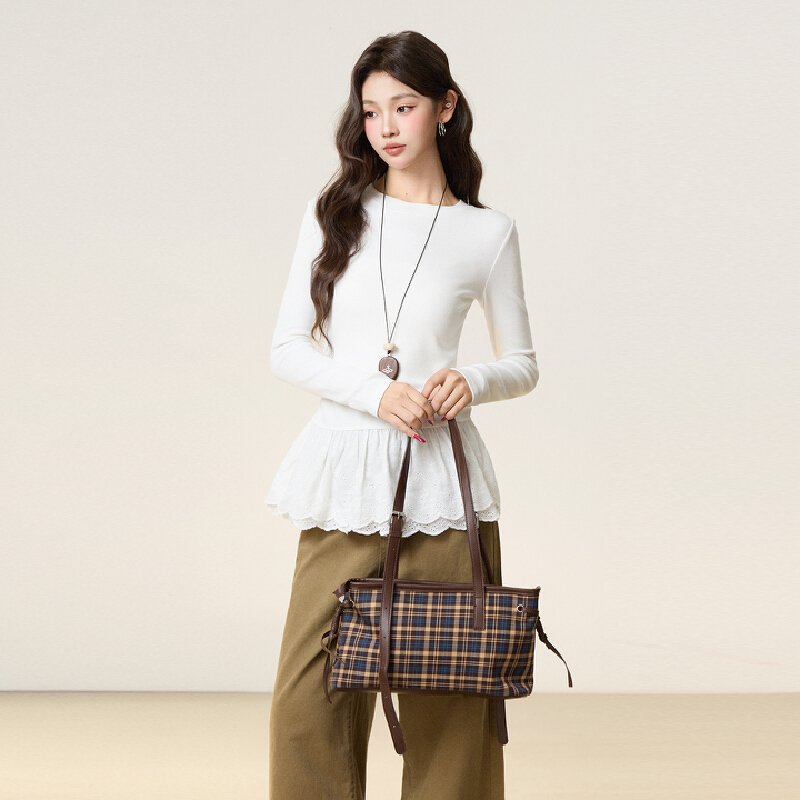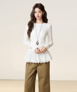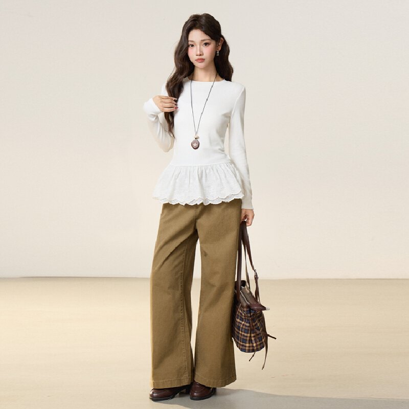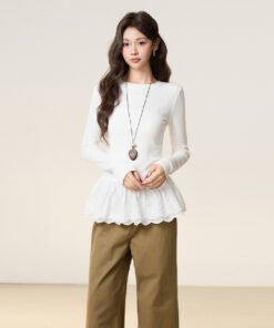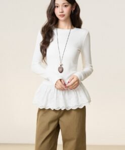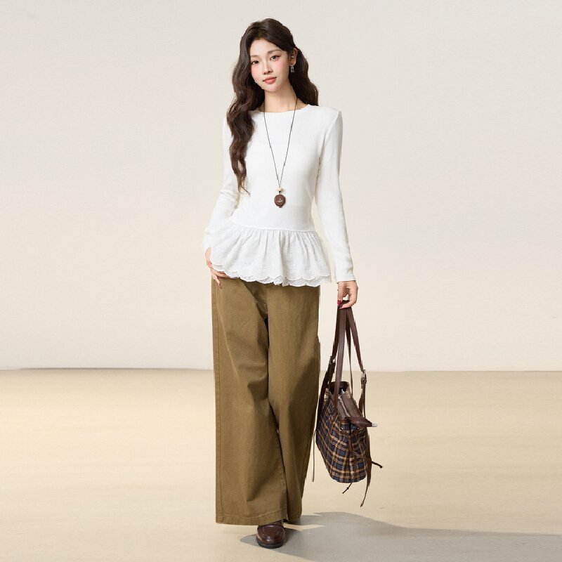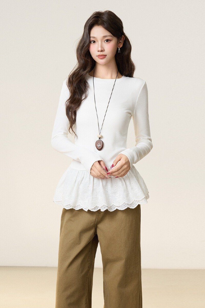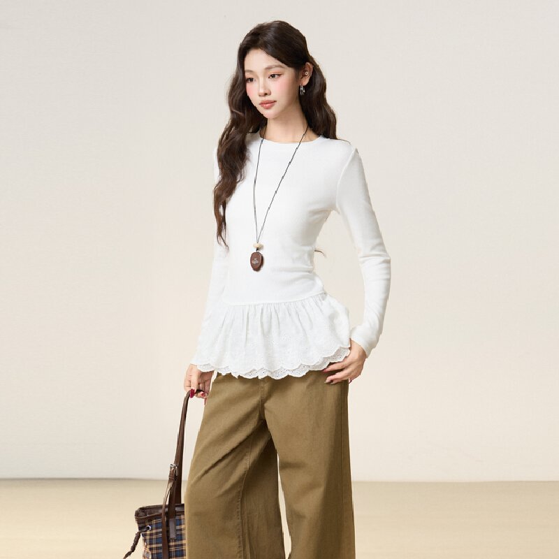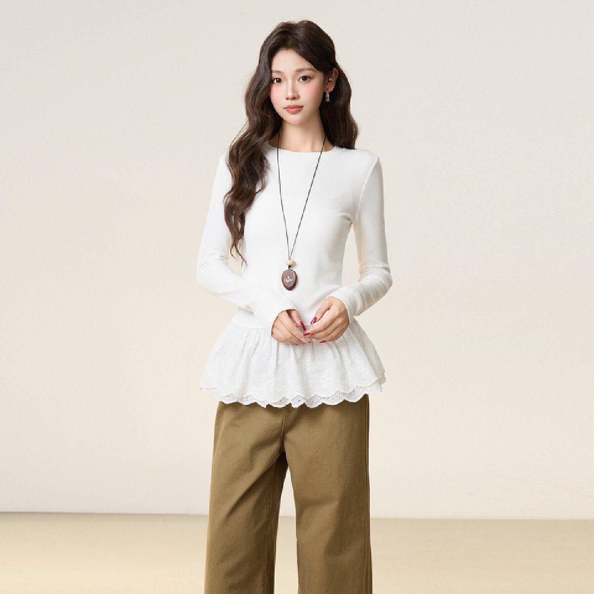 Vapetix S-L Real-shot crewneck lace-trimmed spliced long-sleeved T-shirt for women—new autumn/winter style, sli