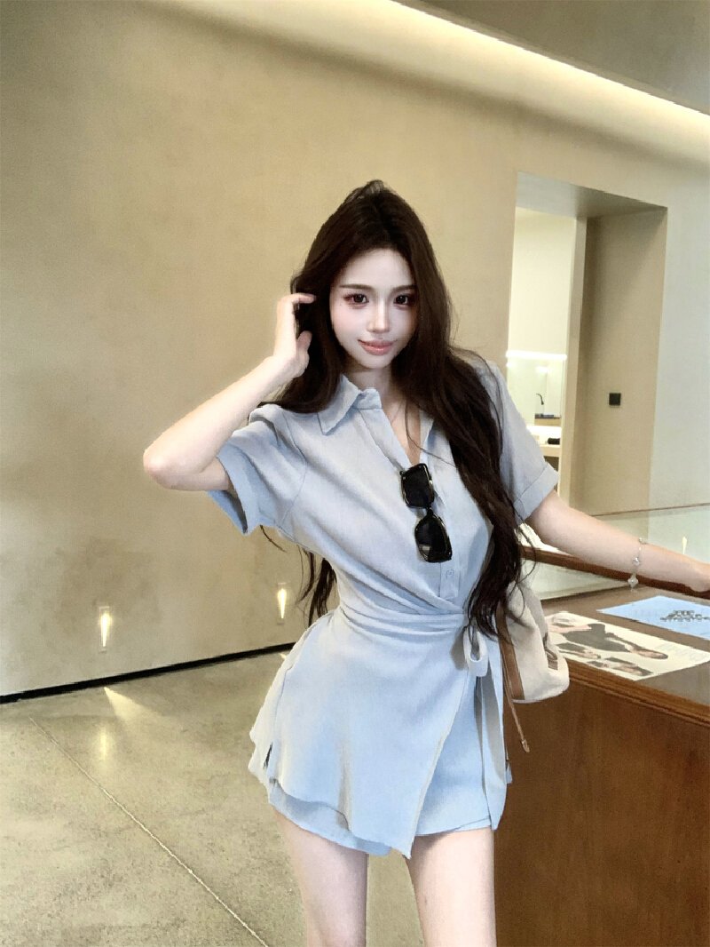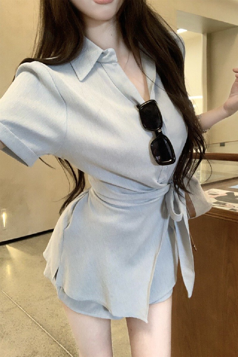 Vapetix S-M Real shot ~ Designer style, elegant, lapel, strap, cinched waist blouse dress, commuting high-waist