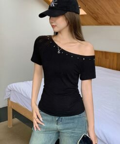 Vapetix S-XL [40s pure cotton] off-shoulder rivet design short-sleeved T-shirt women’s slim-fit cropped top