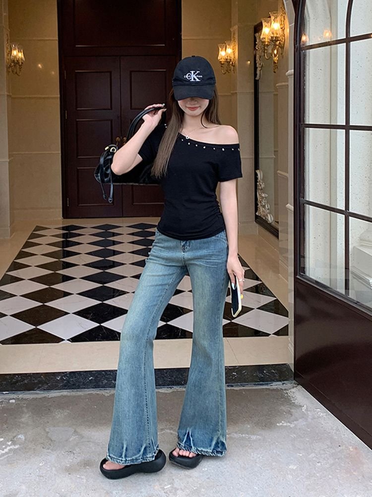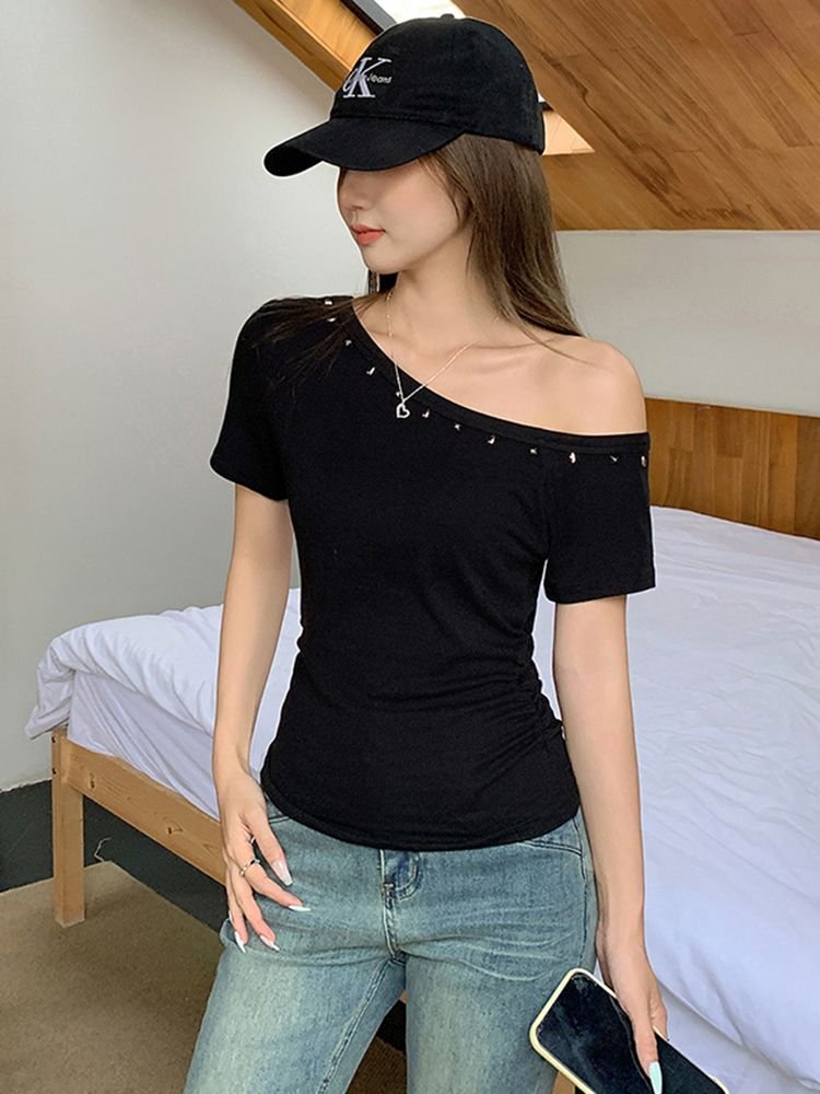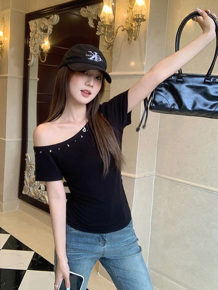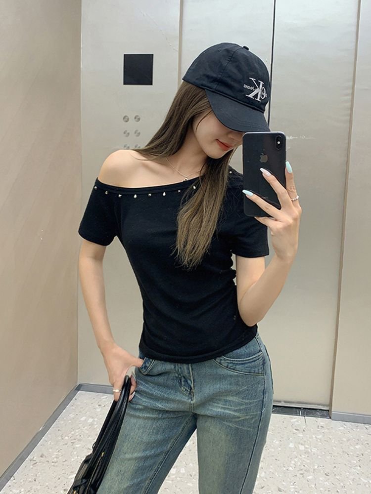 Vapetix S-XL [40s pure cotton] off-shoulder rivet design short-sleeved T-shirt women’s slim-fit cropped top