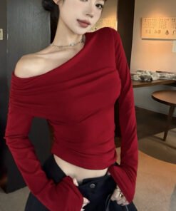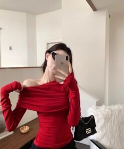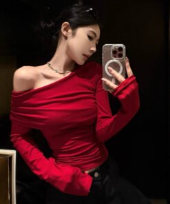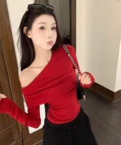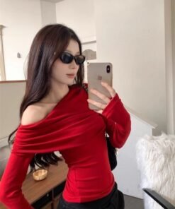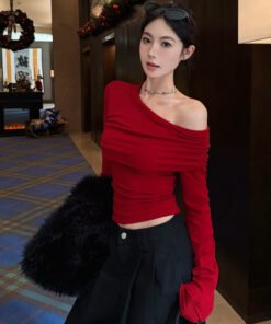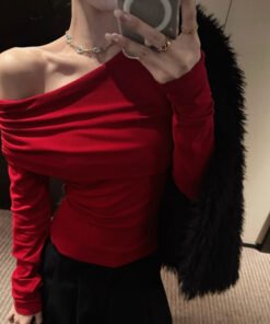 Vapetix S-XL Ankorah Red Slanted Collar Off-the-Shoulder Base Shirt for Women, 2025 Autumn Christmas New Year Ni