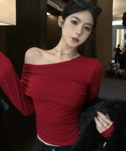 Vapetix S-XL Ankorah Red Slanted Collar Off-the-Shoulder Base Shirt for Women, 2025 Autumn Christmas New Year Ni