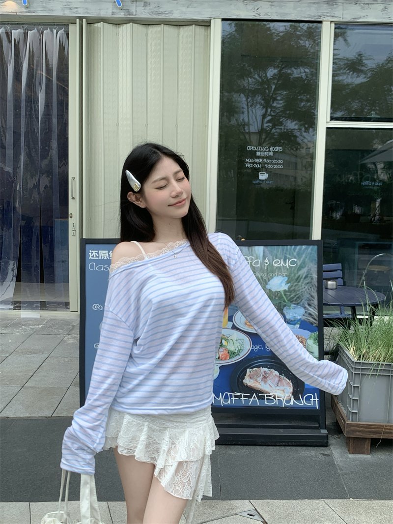 Vapetix S-XL Authentic Photograph Real Off-the-Shoulder Striped T-Shirt for Women Summer Korean Style Lazy Wind
