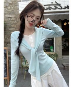 Vapetix S-XL Modal Cotton Spliced Fake Two-Piece T-shirt with Flowing Ribbon, Long Sleeves – Women’s Spring Seas
