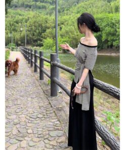 Vapetix S-XL MR【Original Color-Woven Stripes】French Asymmetrical Shoulder Striped Short-Sleeve T-Shirt for Women