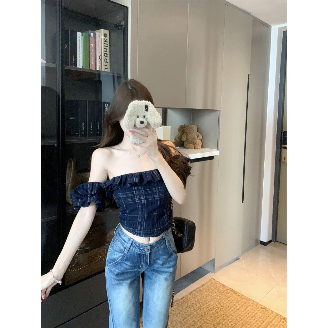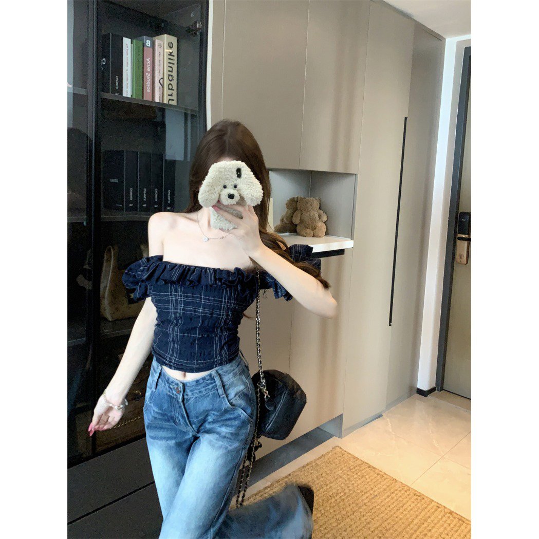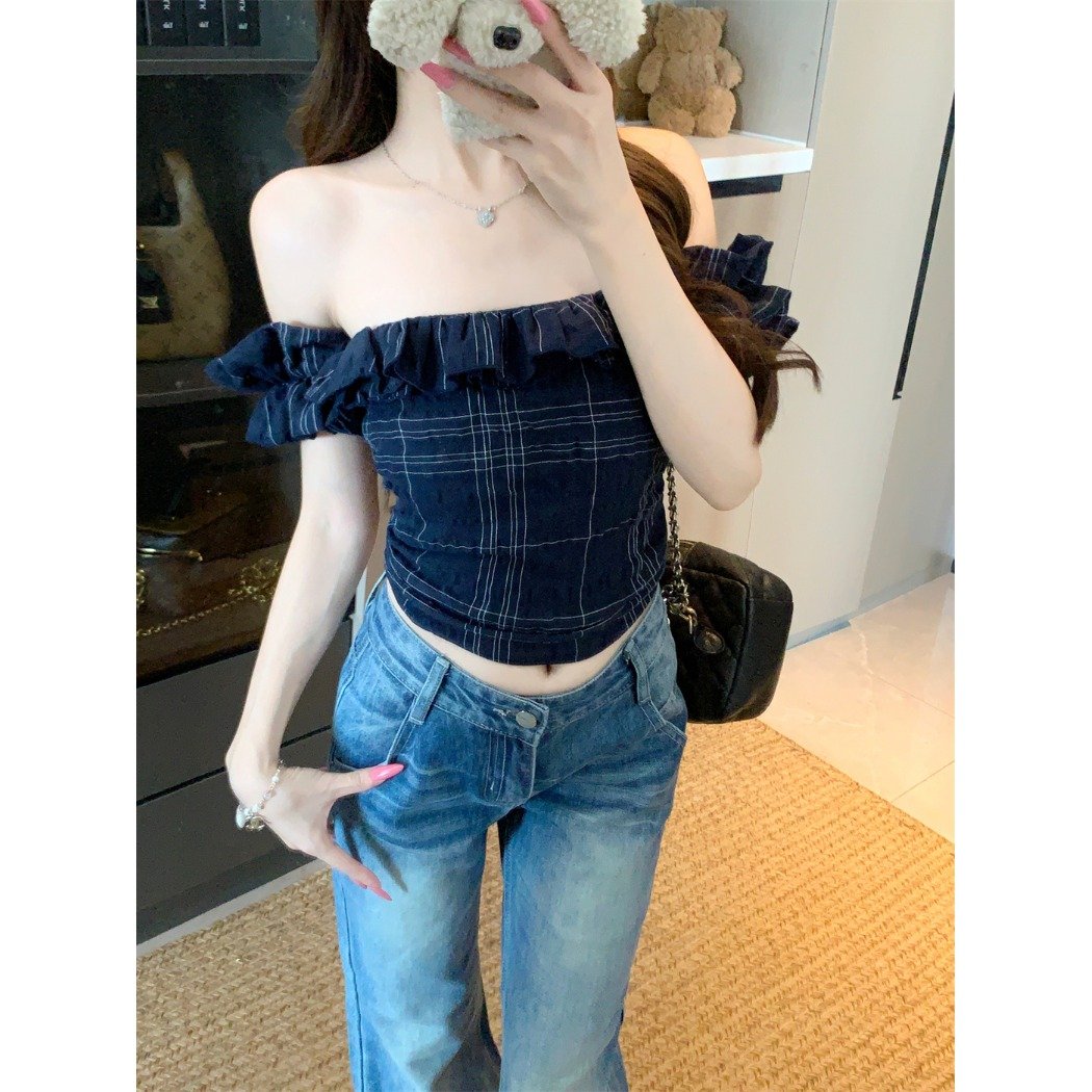 Vapetix S-XL MR [Original Fabric] Off-Shoulder Ruffled Short-Sleeved T-Shirt Women’s Summer Retro Plaid Slim-Fit