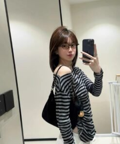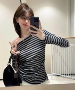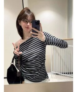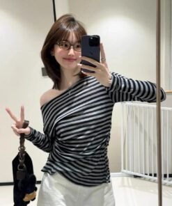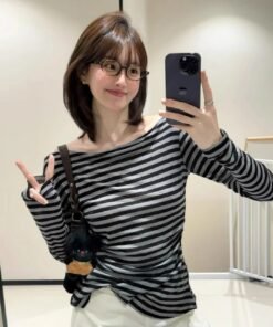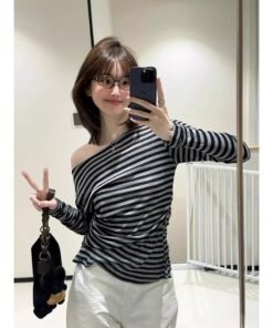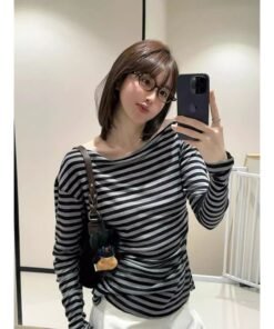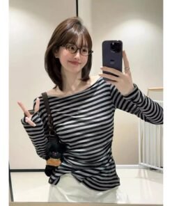 Vapetix S-XL Original Color-Woven Striped Off-the-Shoulder Long-Sleeve T-Shirt for Women, Korean Style Design, O