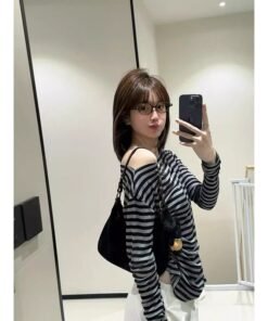 Vapetix S-XL Original Color-Woven Striped Off-the-Shoulder Long-Sleeve T-Shirt for Women, Korean Style Design, O