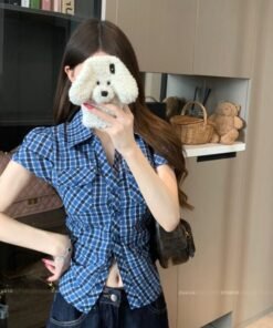 Vapetix S-XL Original Style Retro Plaid Short-Sleeve Shirt for Women – Summer Fitted Slimming Waist Sweet and Sp