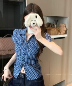 Vapetix S-XL Original Style Retro Plaid Short-Sleeve Shirt for Women – Summer Fitted Slimming Waist Sweet and Sp