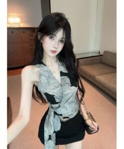 Vapetix S-XL Women’s Summer Tie-Band Crop Top with Retro Print, Intersecting V-Neck, Knit Striped Fabric, Body-F