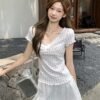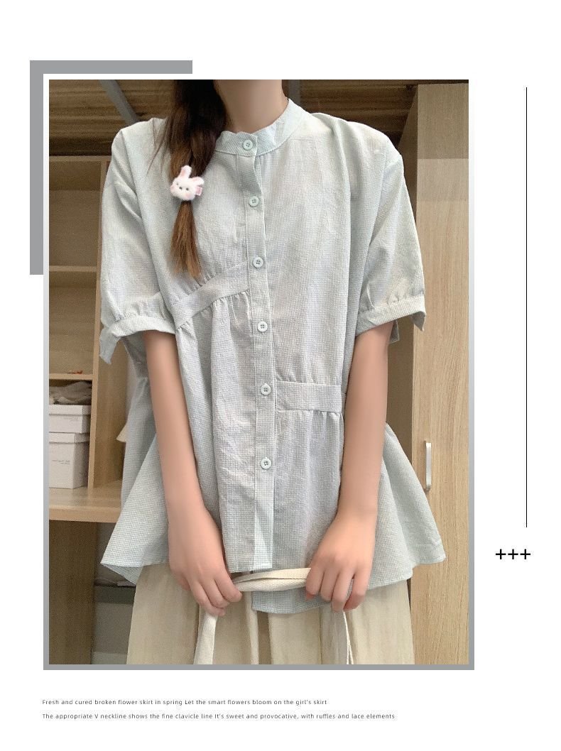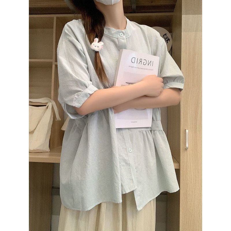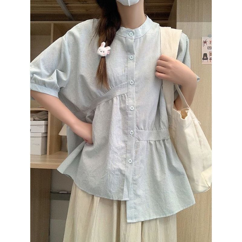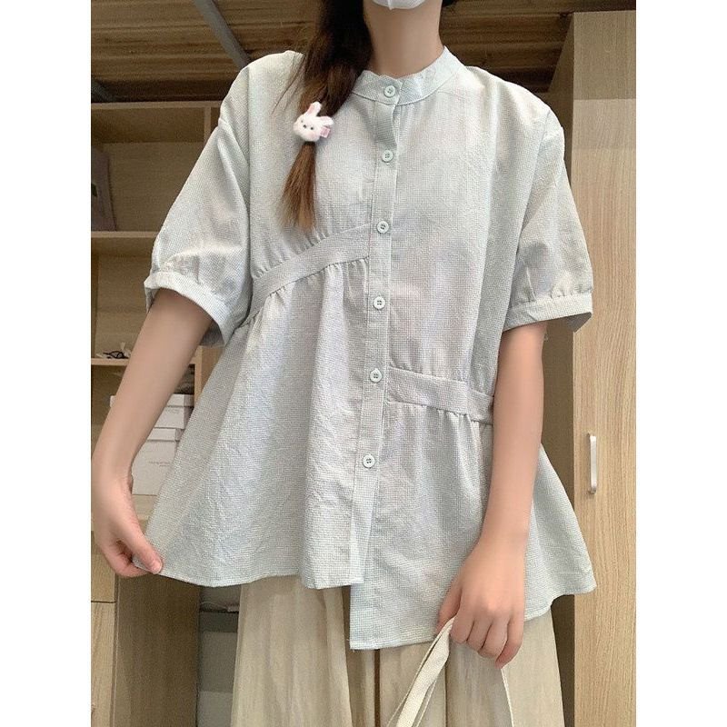 Vapetix XXS white spaghetti strap no print-3XL Japanese-style lazy checkered shirt for women, summer irregular short-sleeve blouse with bubble sle
